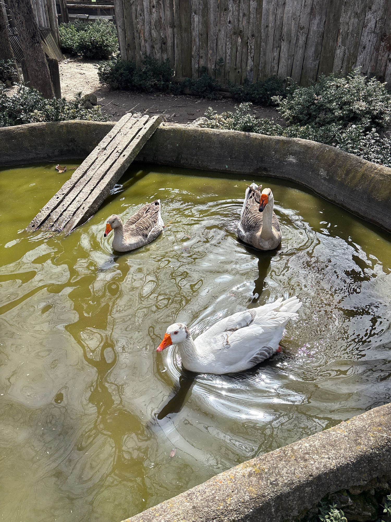 The image shows a circular concrete water trough containing murky water with three geese swimming in it. Two geese are brown and grey, while one is white with an orange beak. The trough is located out…read more