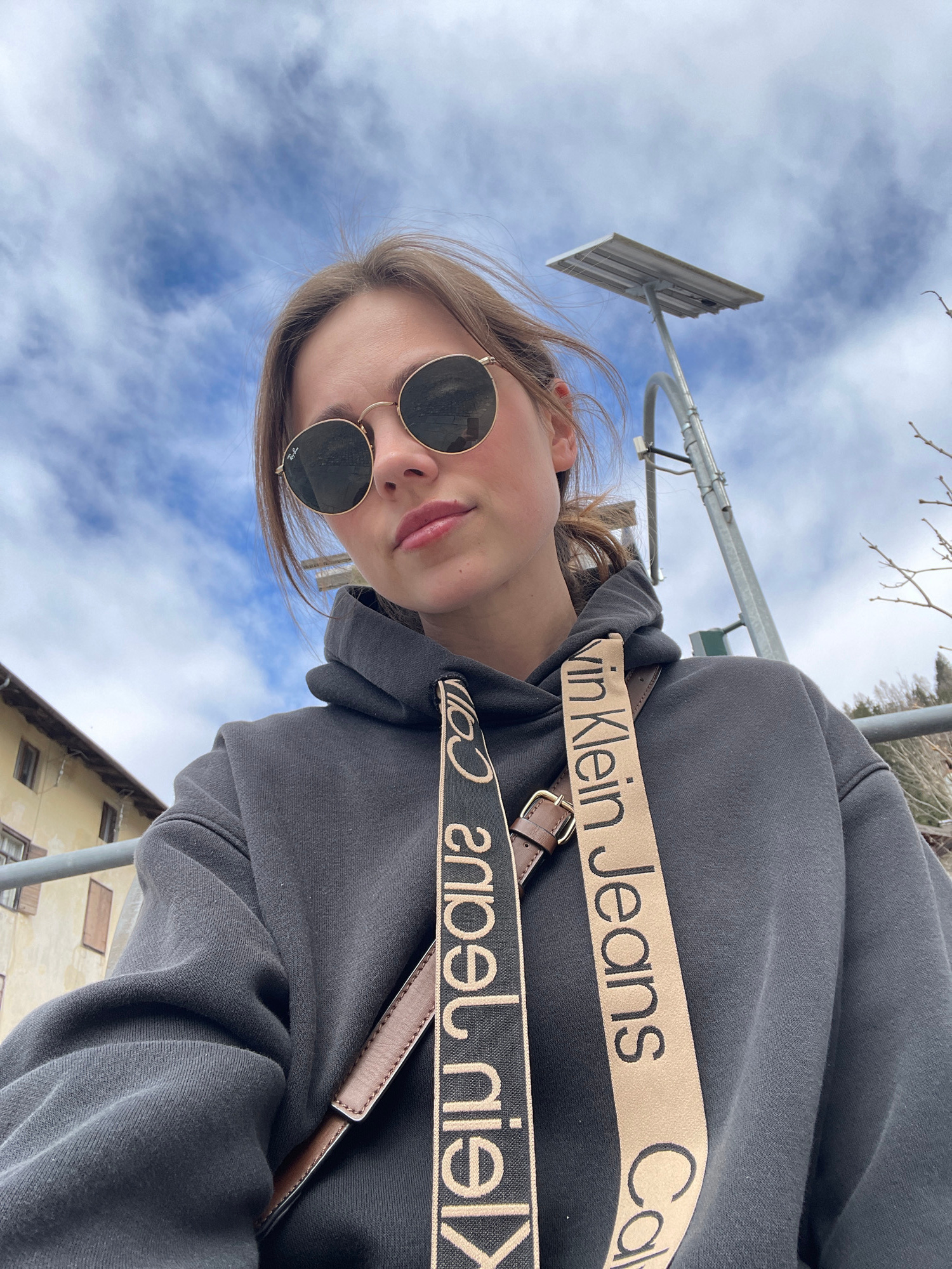 A young woman poses for a selfie in Sappada, Italy. She wears round, dark sunglasses and a gray hoodie with Calvin Klein Jeans straps. In the background, there's a street lamp against a blue sky with…read more