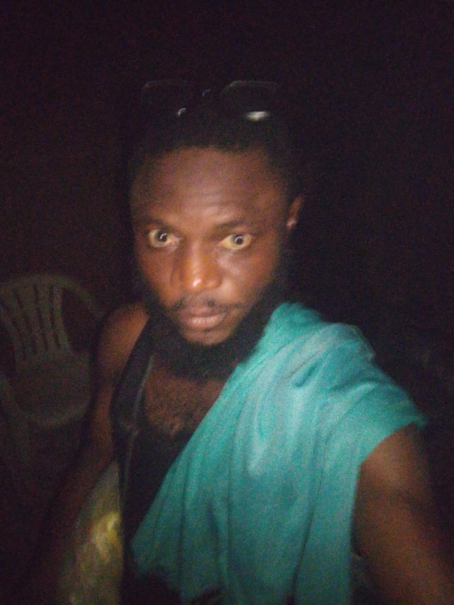 The image depicts a man with dark skin, a beard, and short, dark hair, wearing a black tank top and a turquoise cloth draped over his shoulder. He is looking directly at the camera with a serious expr…read more