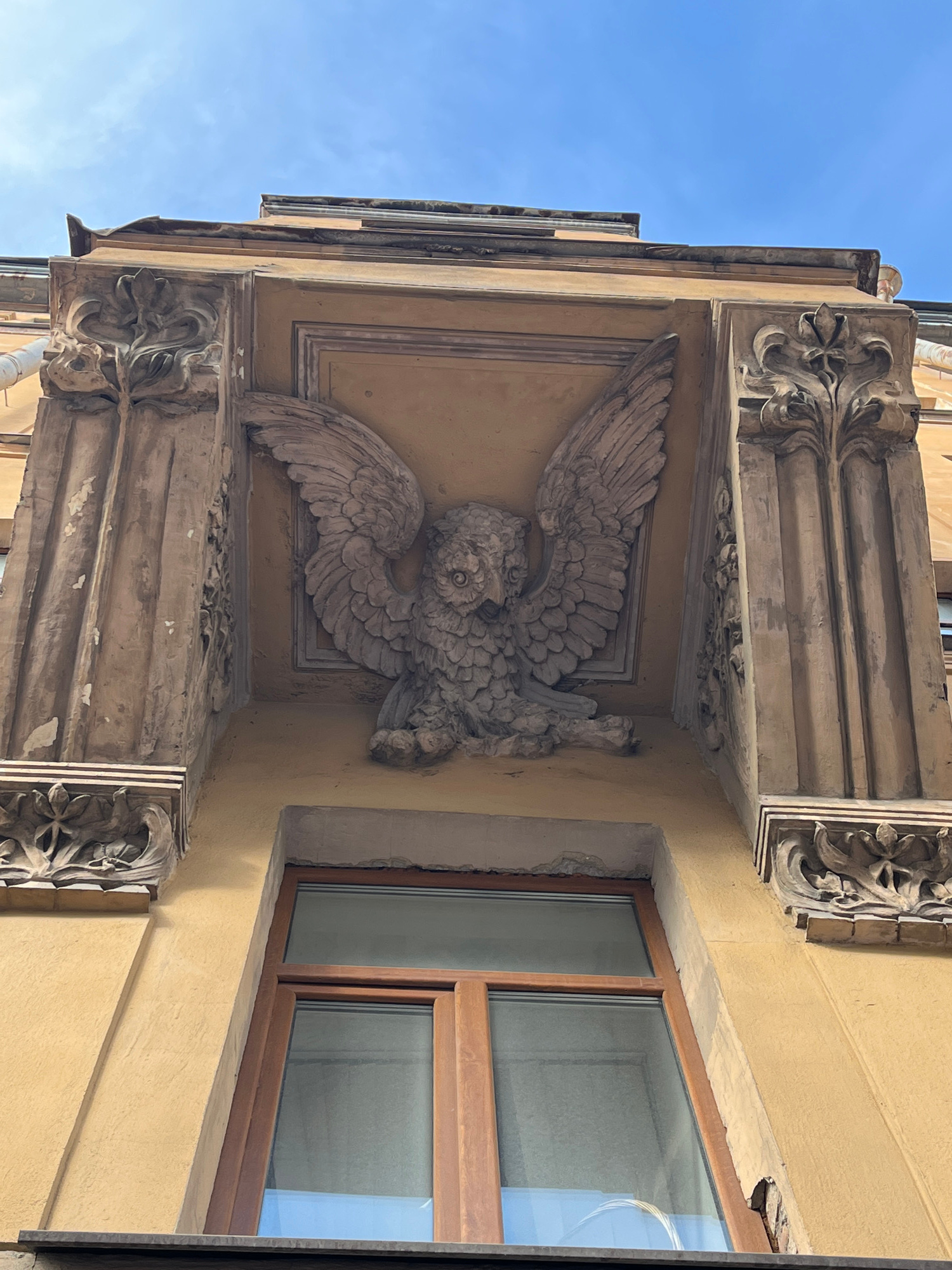 The image is a low-angle, close-up shot of a building corner featuring ornate architectural details in Saint Petersburg, Russia. The building has a yellow facade and a window with a brown frame. A scu…read more