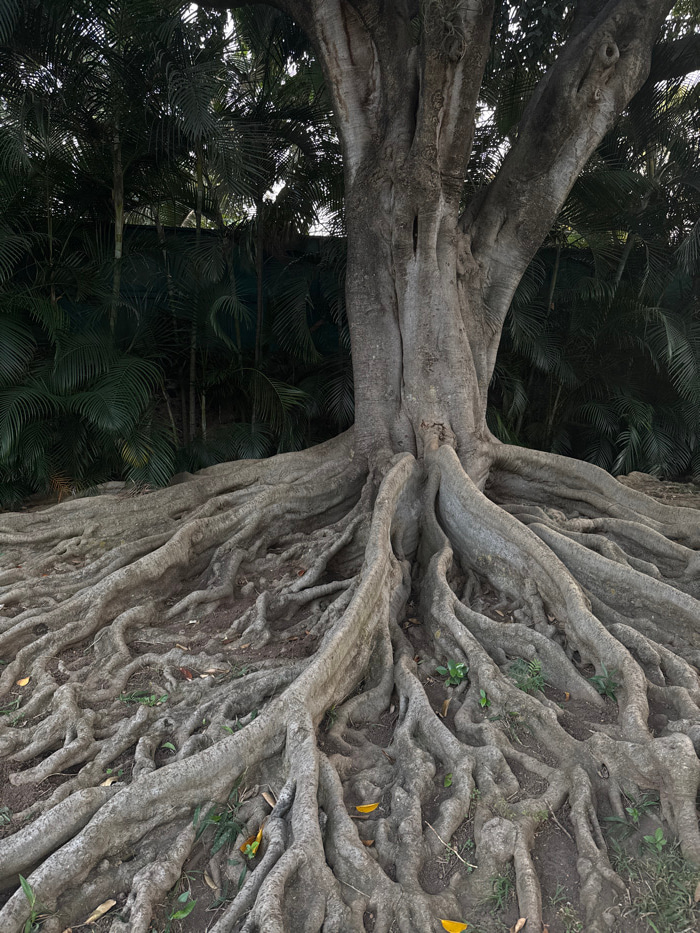 A large, old tree with expansive, above-ground roots dominates the scene. The thick, gray roots intertwine and spread across the ground, interspersed with patches of dirt, small plants, and fallen lea…read more