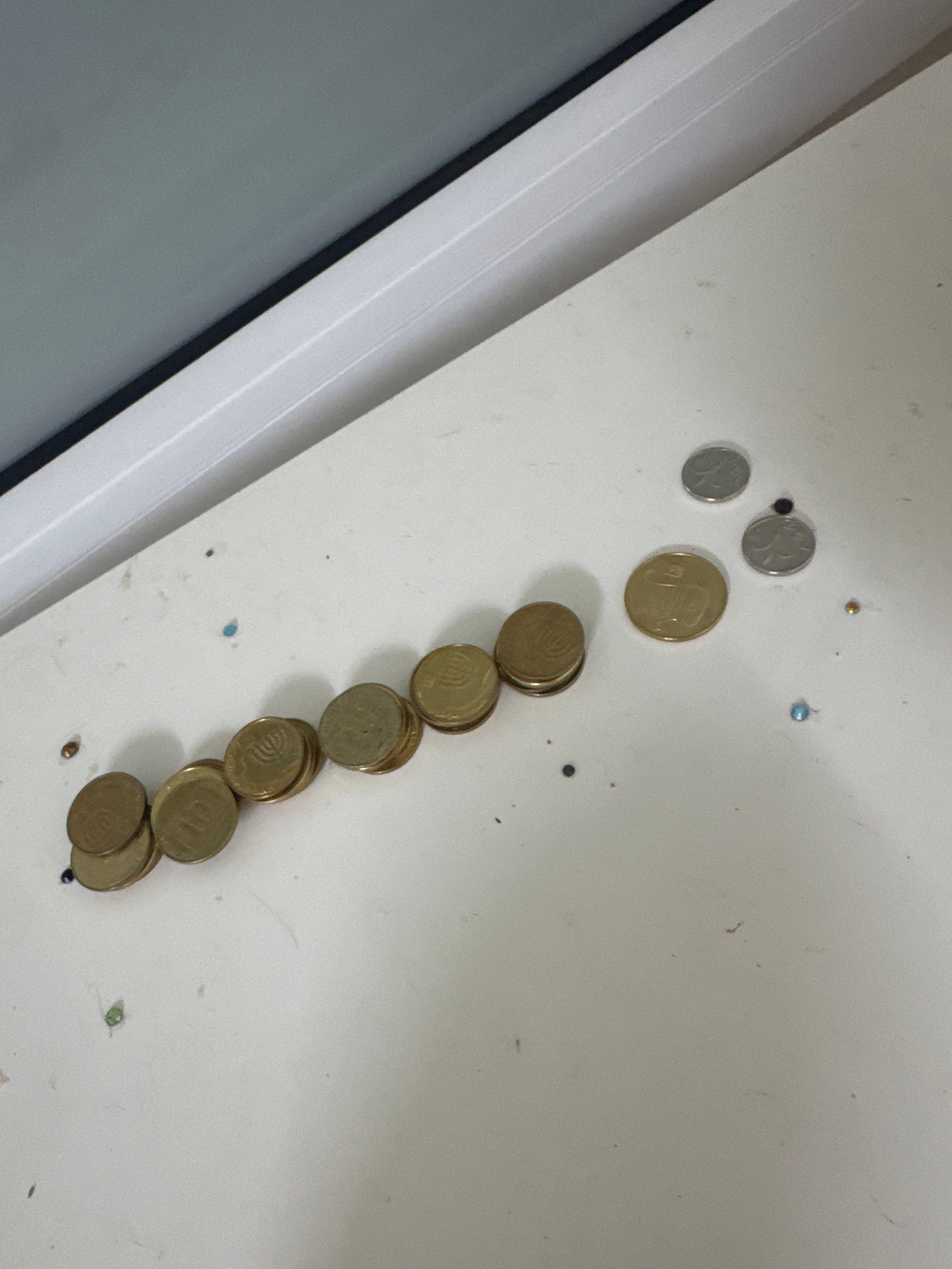 The image shows a collection of Israeli coins arranged on a white surface. Two silver-colored coins and one larger gold-colored coin are located near the top of the image. A series of ten Shekel coinsβ¦read more