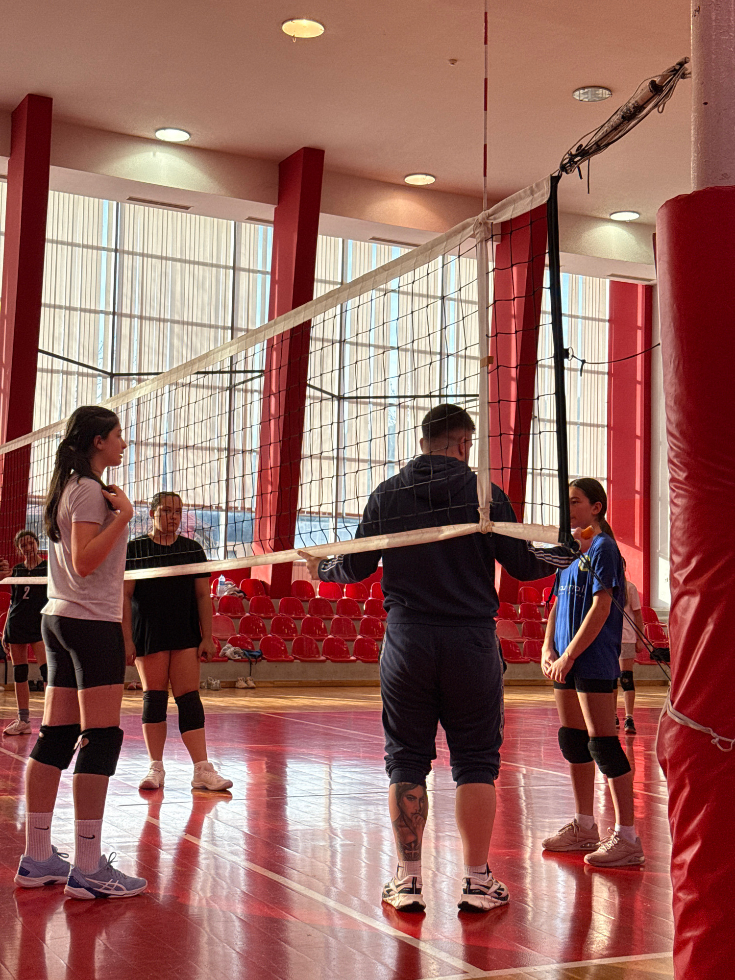 A volleyball net divides an indoor gymnasium. Several people are visible on either side of the net. On the left of the net, a young woman with long dark hair stands in a light-colored t-shirt and dark…read more