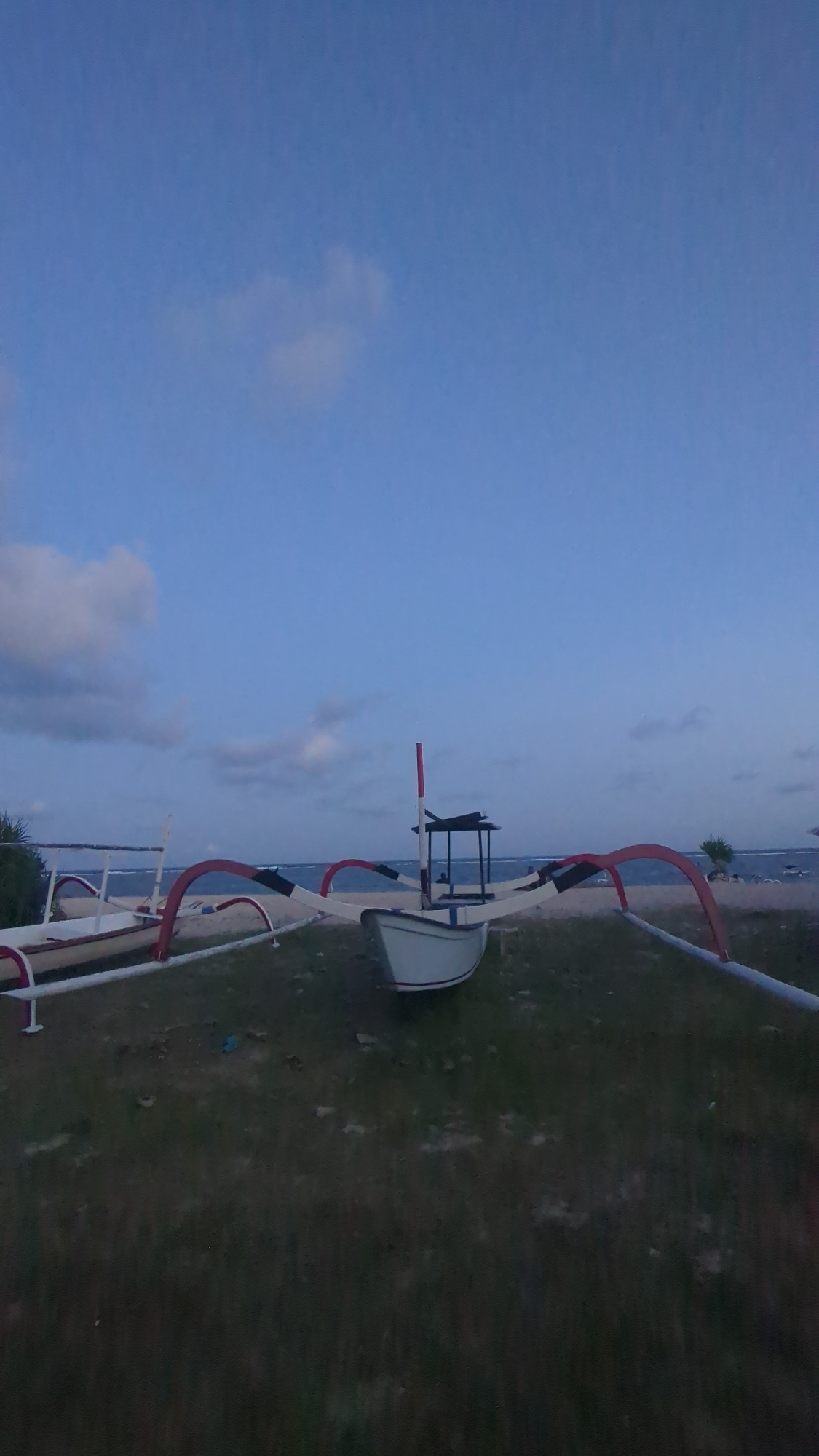 The image depicts a traditional outrigger boat, known as a "jukung," resting on a beach in Unknown, Indonesia. The jukung is characterized by its long, narrow hull and bamboo outriggers with red accen…read more