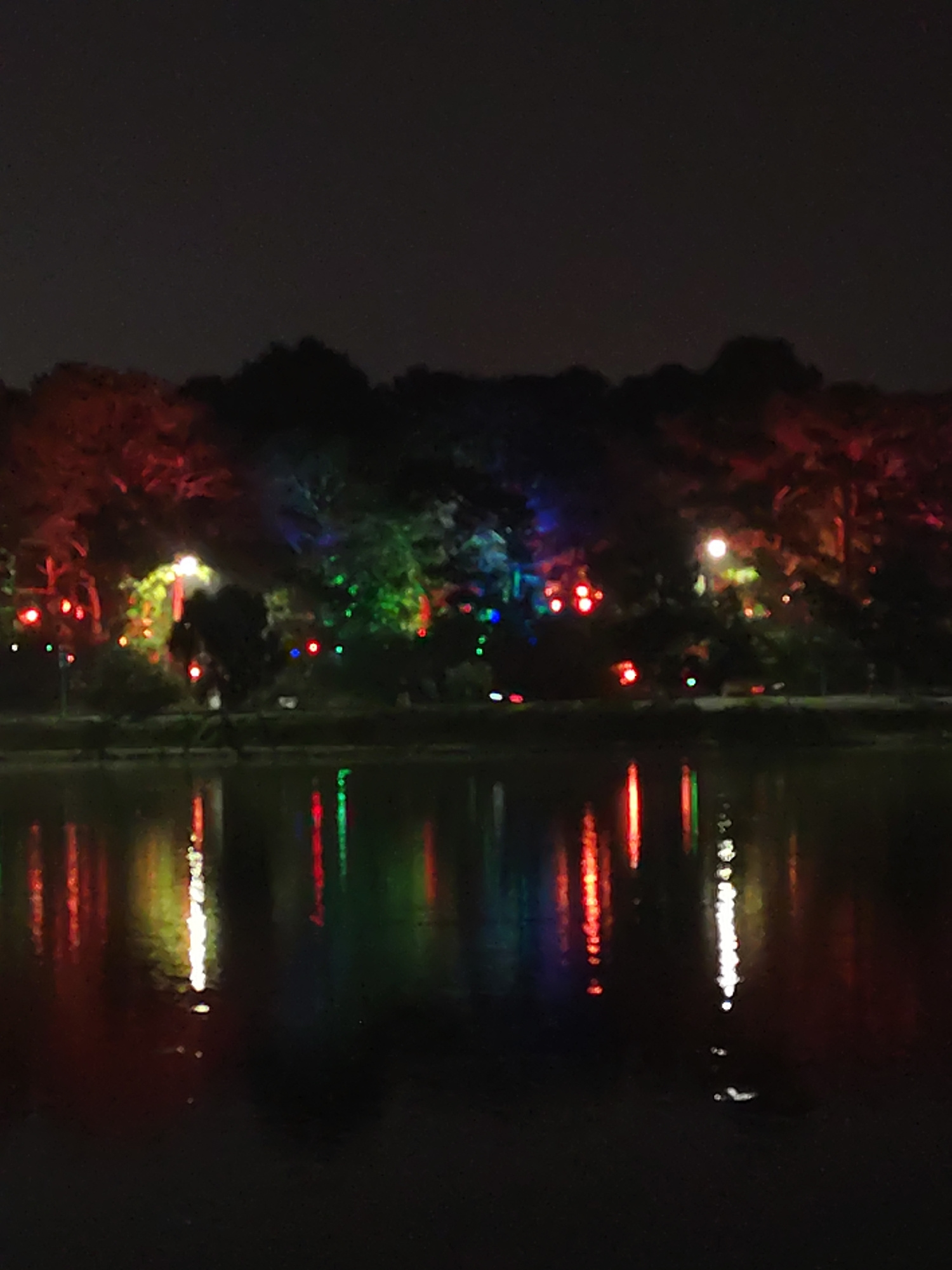 At night, colored lights are reflected in a body of water. The lights are primarily red, green, and white, and they illuminate the trees and structures along the water's edge. The image is focused on…read more