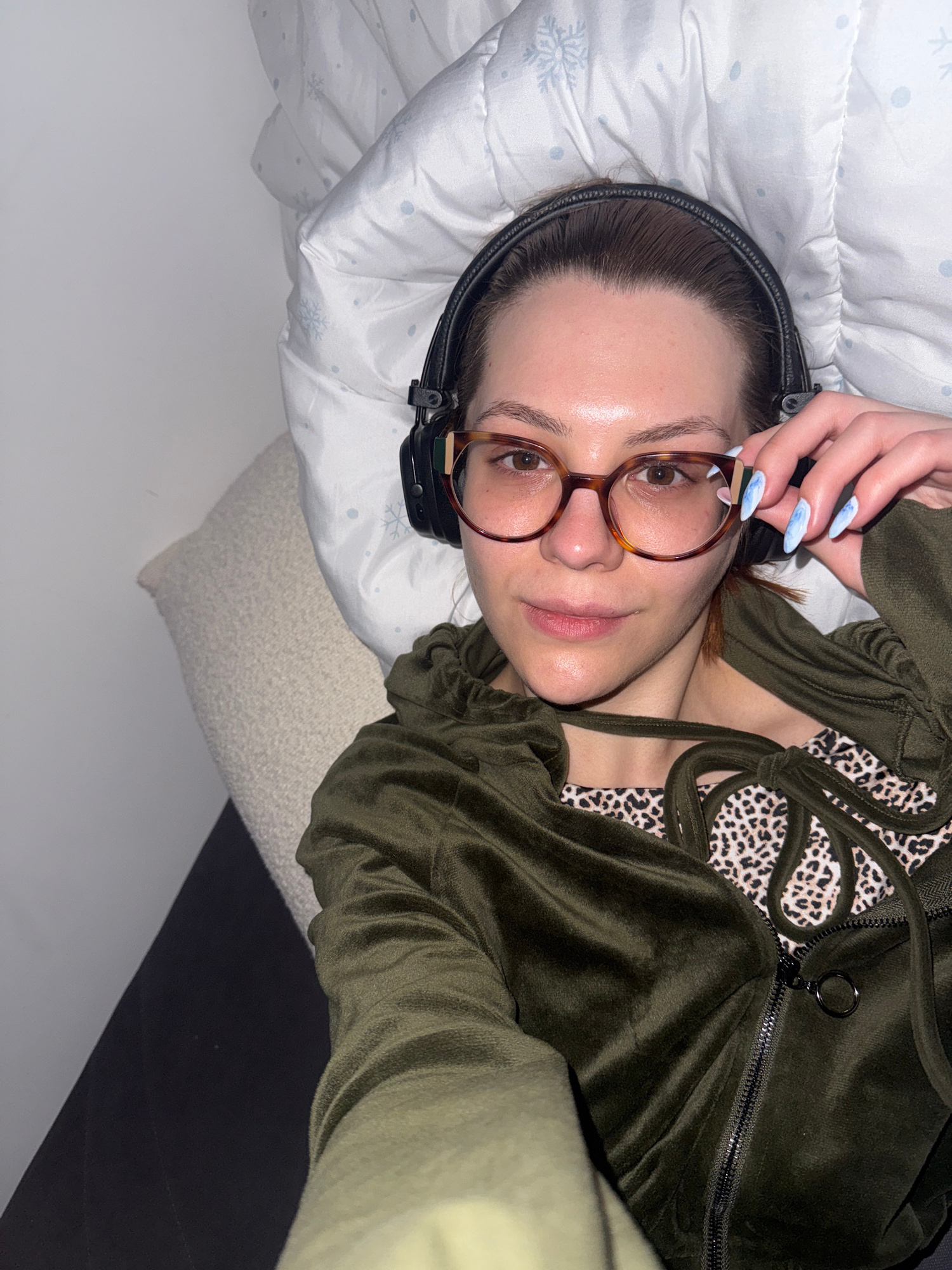 A young woman is depicted lying on her side in an indoor setting, gazing directly at the viewer. She rests her head on a white pillow or duvet adorned with subtle light blue snowflake patterns. She ha…read more