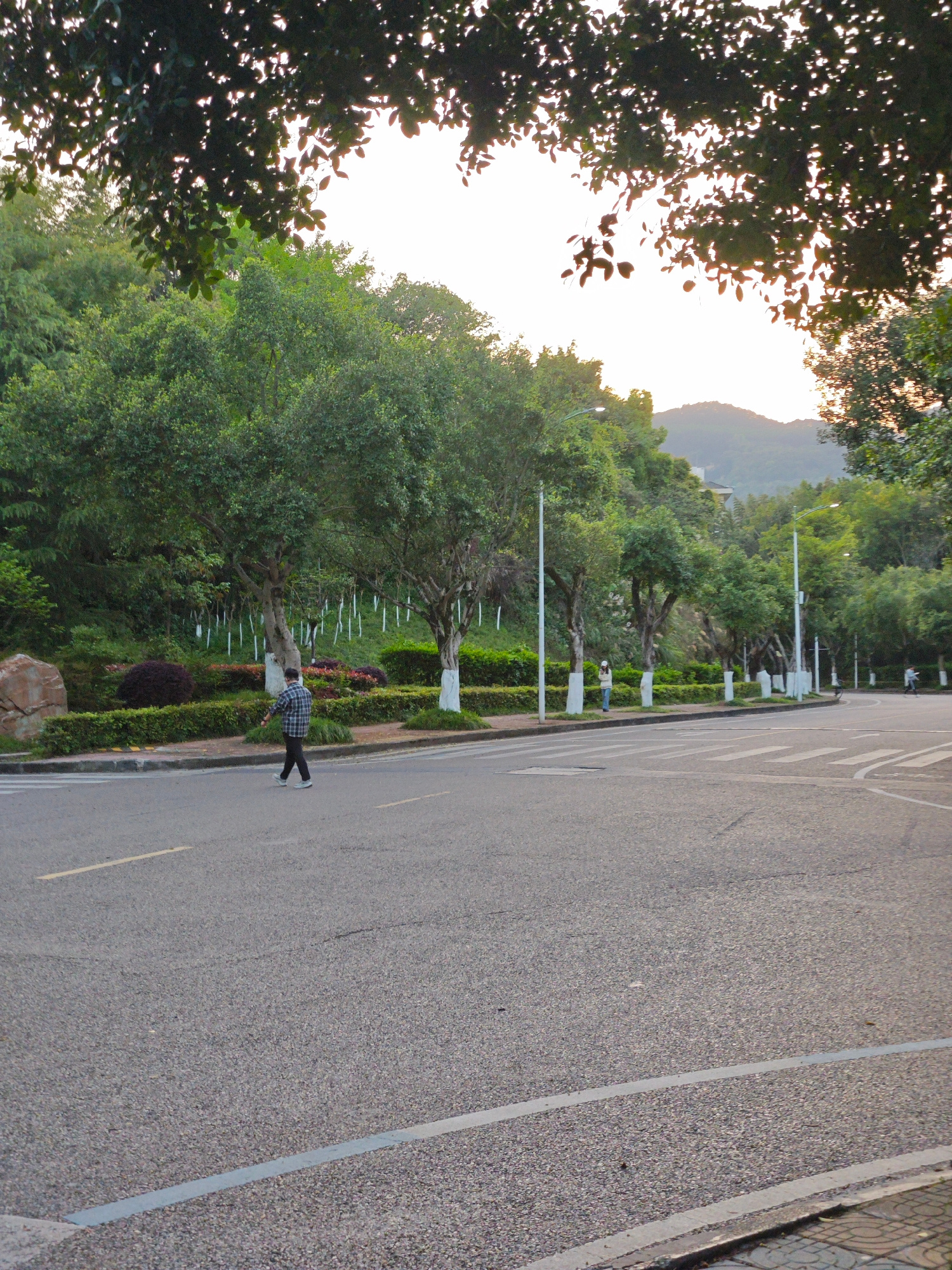 The image depicts a street scene in the Chongqing High-tech Zone, China. The scene includes a wide asphalt road with pedestrian crossings. A person is walking across the road. Landscaped areas with tr…read more
