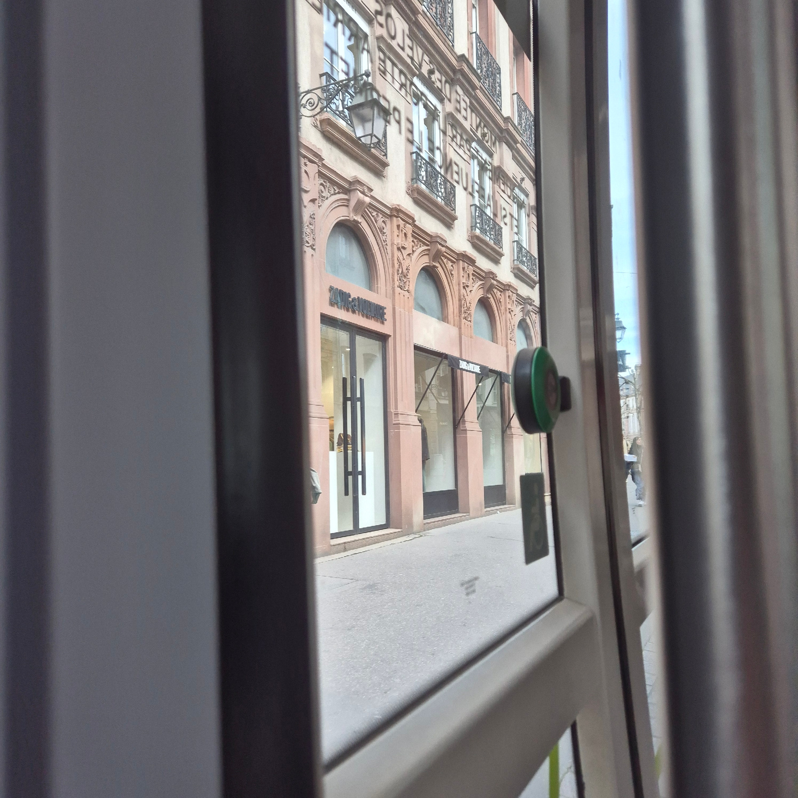 An image, rotated 90 degrees clockwise, captures an urban street scene in Strasbourg, France, viewed through a window or barrier. The foreground features several blurry, dark horizontal bars, likely pā¦read more
