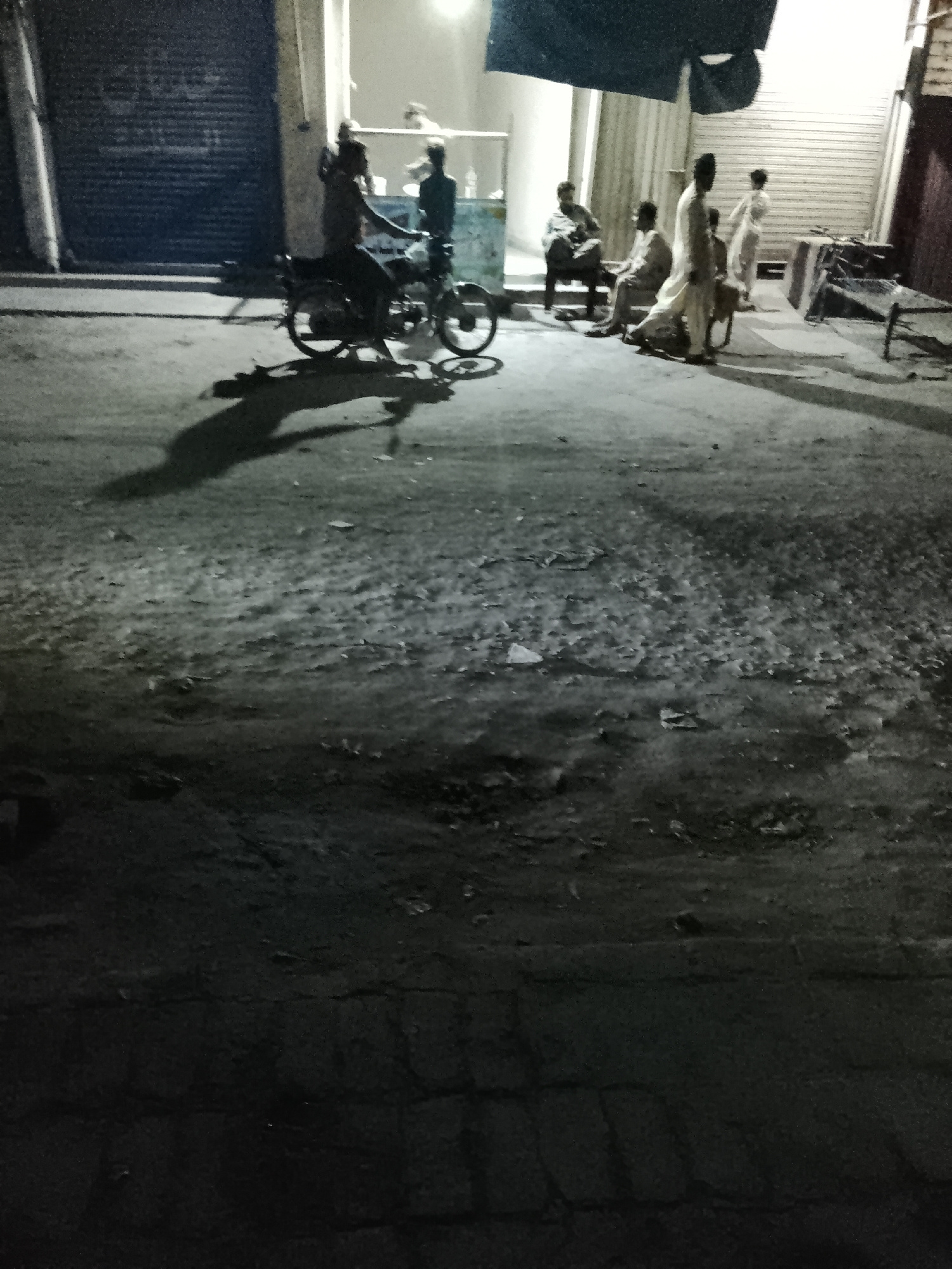 This nighttime image depicts an informal gathering on a street or alleyway in Nasheman Colony, Pakistan. The scene is illuminated by a strong artificial light source emanating from an open doorway or…read more