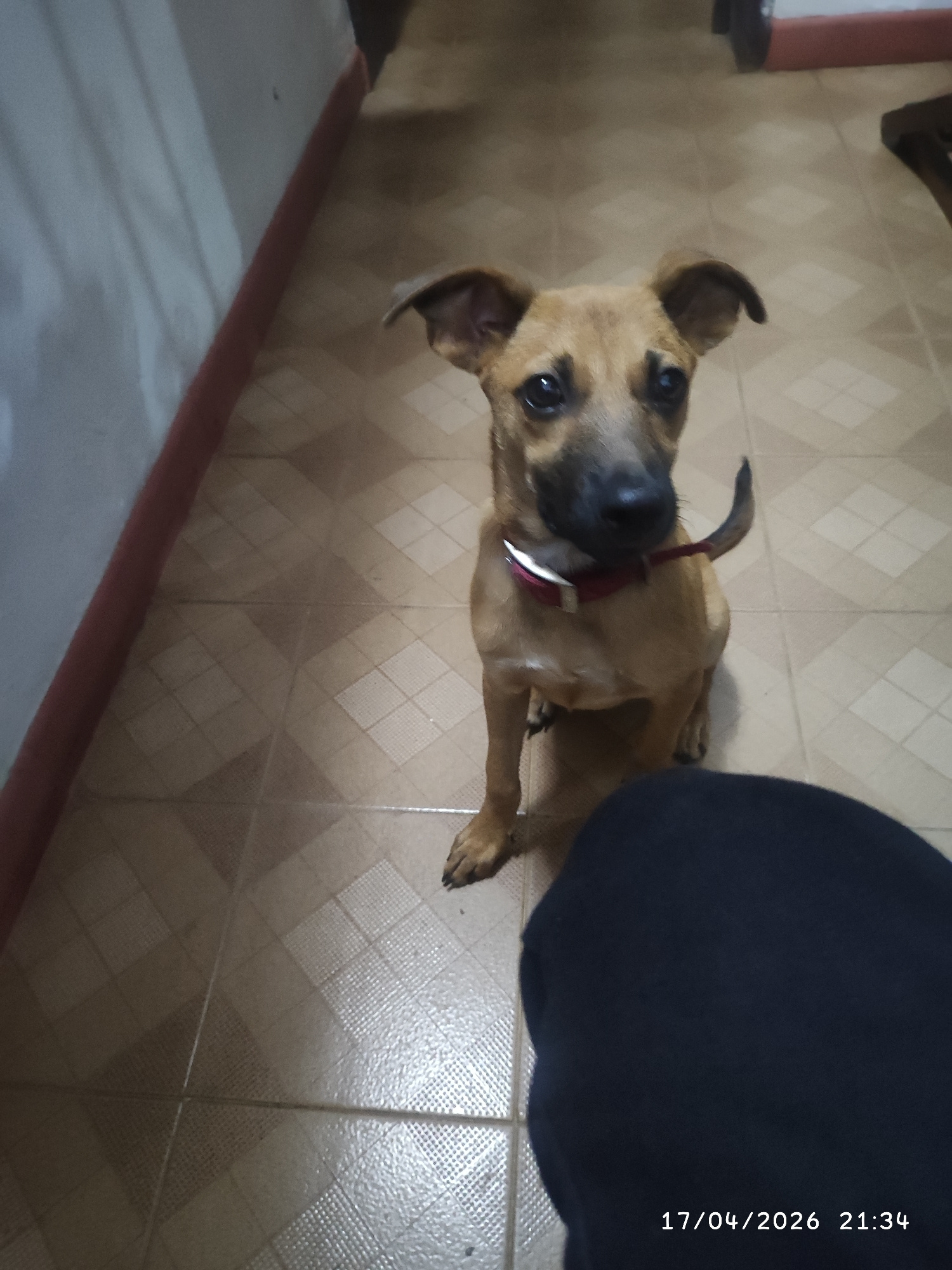 A medium-sized, tan-colored dog with a black muzzle, wearing a red collar, sits on a tiled floor. A person wearing dark clothing is positioned in the foreground, partially obscuring the lower right po…read more