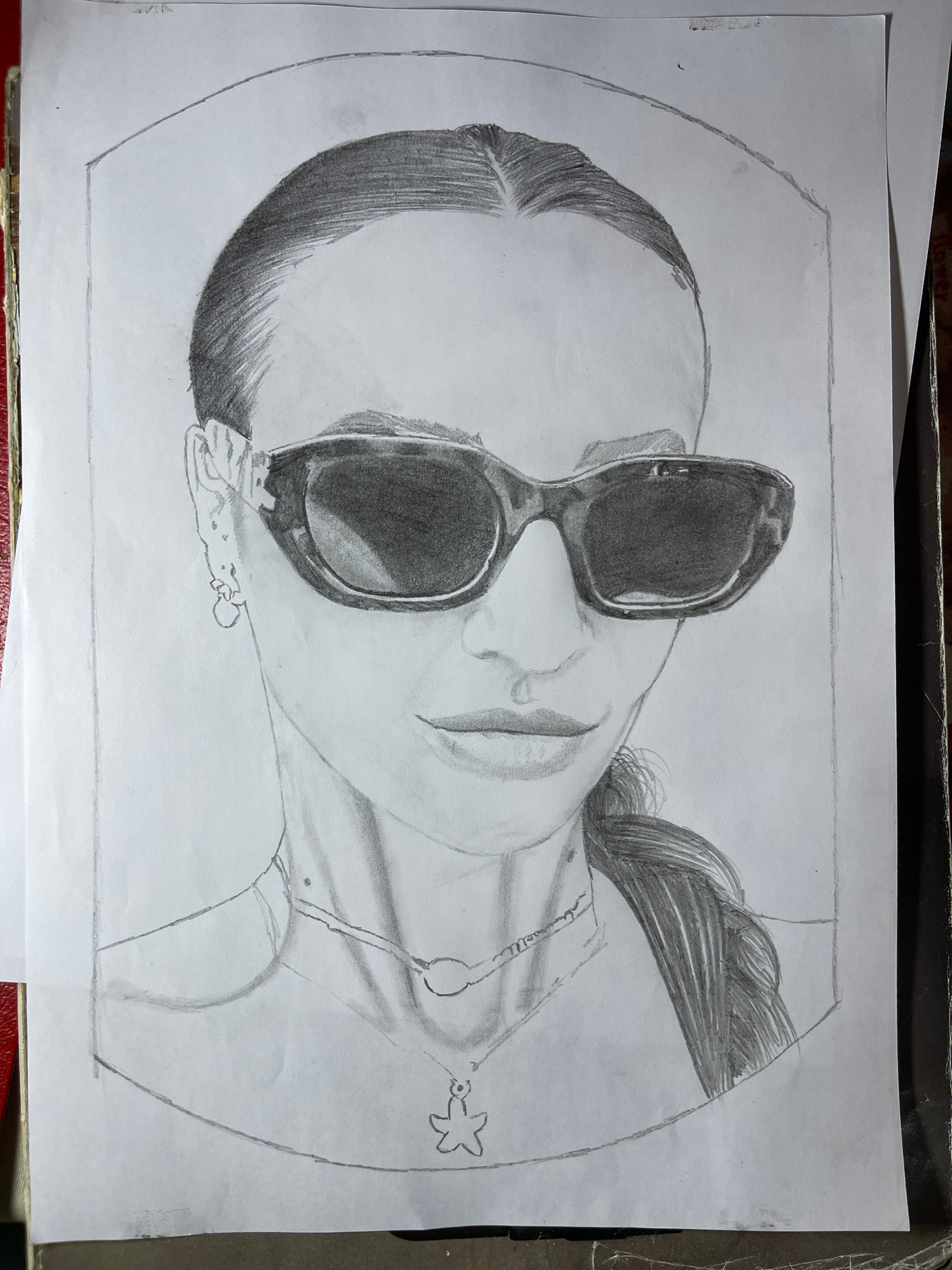 A pencil sketch depicts a person wearing sunglasses. The subject is positioned within an oval border. The individual's hair is styled in a bun, with the remaining hair draped over their shoulder. A ne…read more