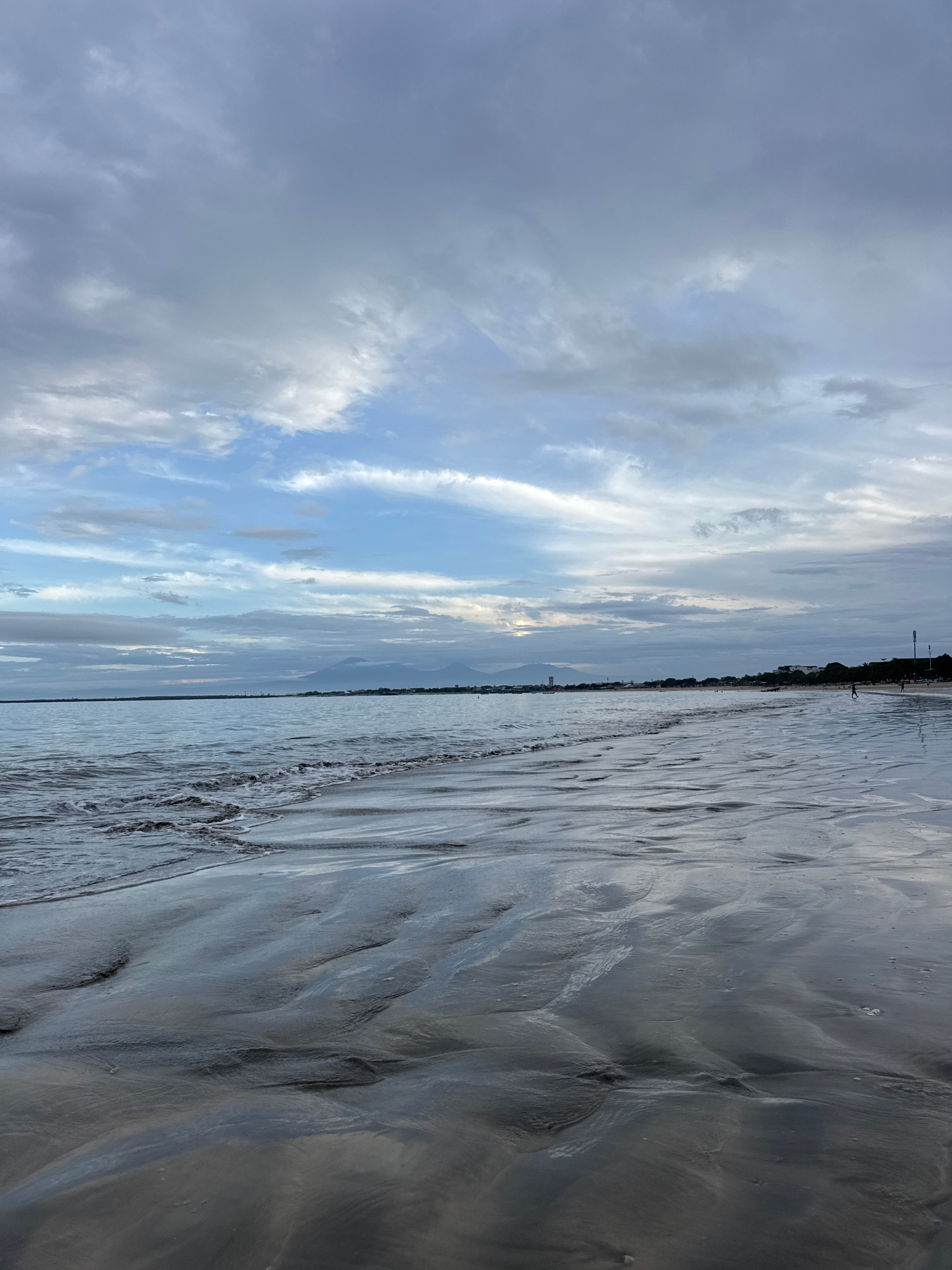 The image, taken in Kuta Selatan, Indonesia, displays a vast, open landscape composed primarily of a cloudy sky and a textured wet sandy or muddy ground. The scene is depicted from a low vantage point…read more