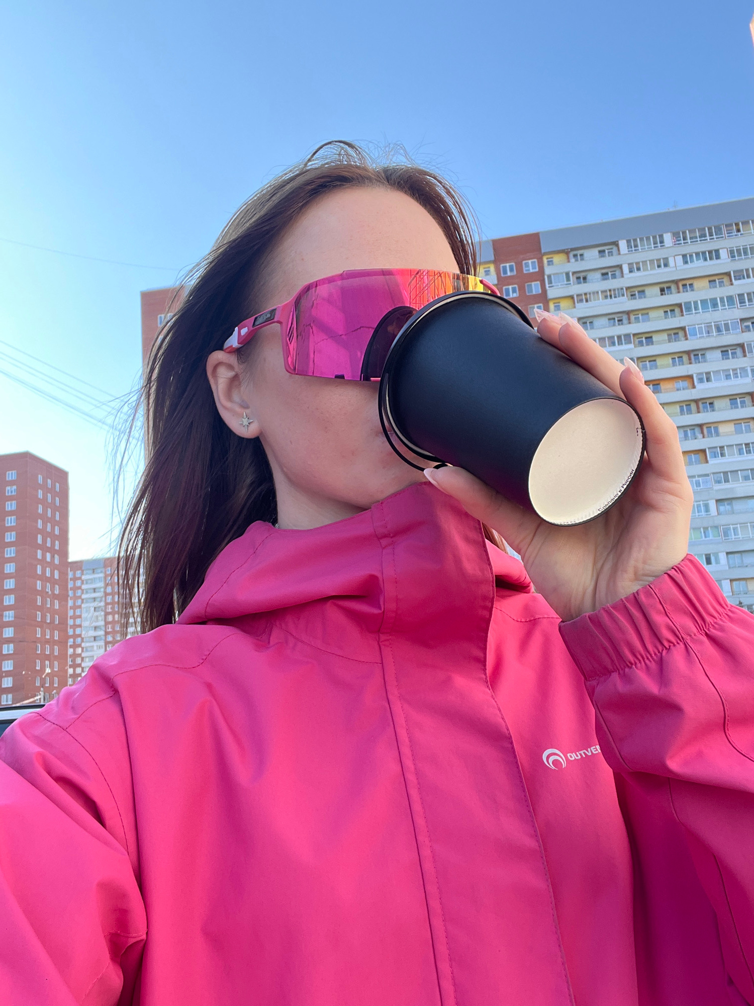 A young woman is captured at an outdoor location in Berezniki, Russia. The photo is taken from a lower angle, looking up at her. She is holding a black cylindrical container, possibly a cup, close to…read more