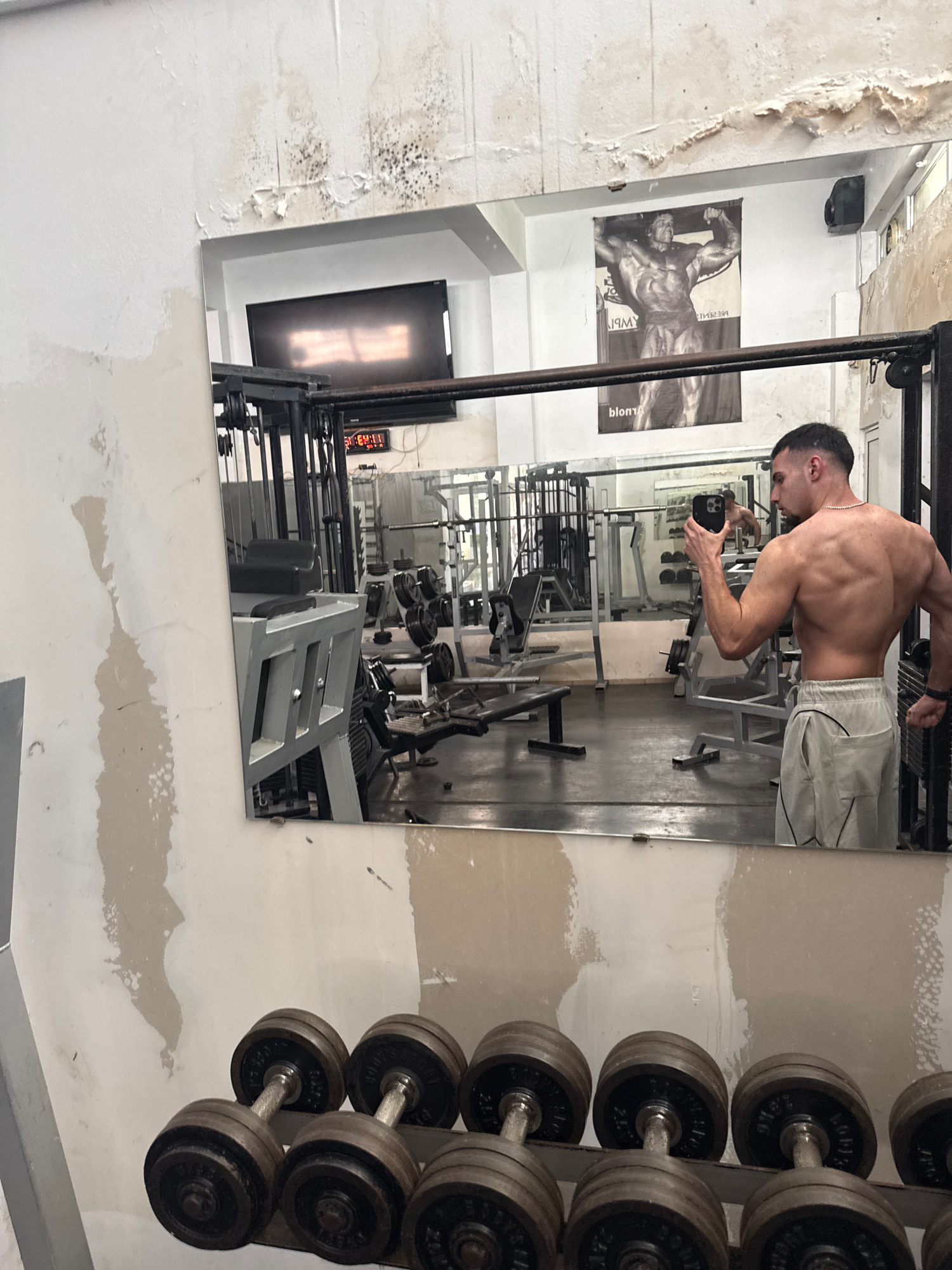 A muscular man with short dark hair and a fade haircut is depicted from the waist up, shirtless, and wearing light-colored athletic shorts, captured in a mirror selfie. He is flexing his back and arm…read more