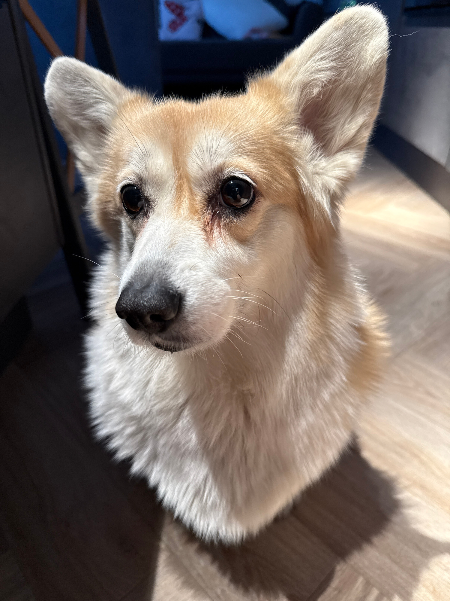 The image features a Pembroke Welsh Corgi dog looking upwards at the camera with an attentive and curious expression. The dog has distinctive fawn and white markings, with the fawn coloration covering…read more