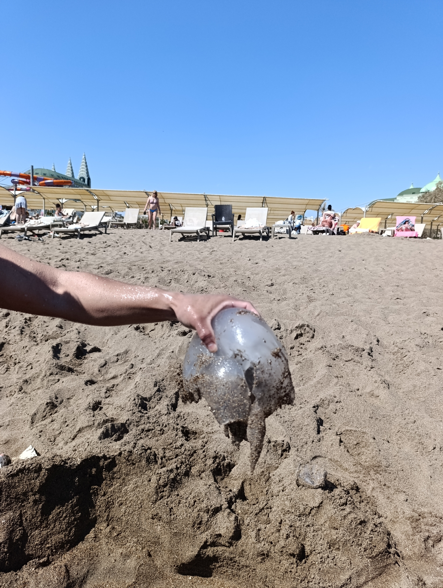 The image captures a sunny day at a beach in Aksu, Turkey. In the foreground, a person's arm holds a clear, gelatinous jellyfish covered with sand. The beach is composed of dark sand, with an uneven s…read more