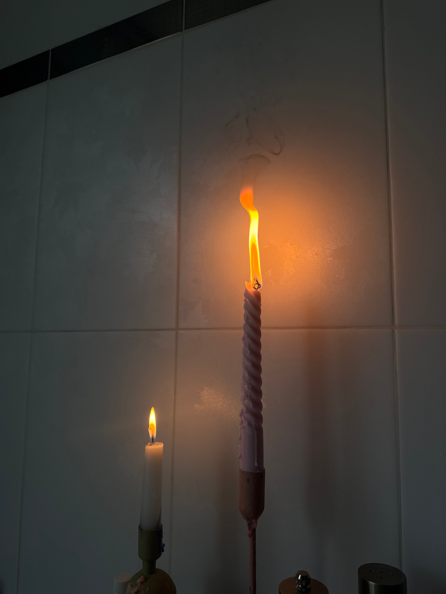 The image displays two burning candles horizontally mounted against a tiled wall in a dimly lit indoor setting, likely in Moscow, Russia. The upper candle is a long, twisted, light purple or off-white…read more