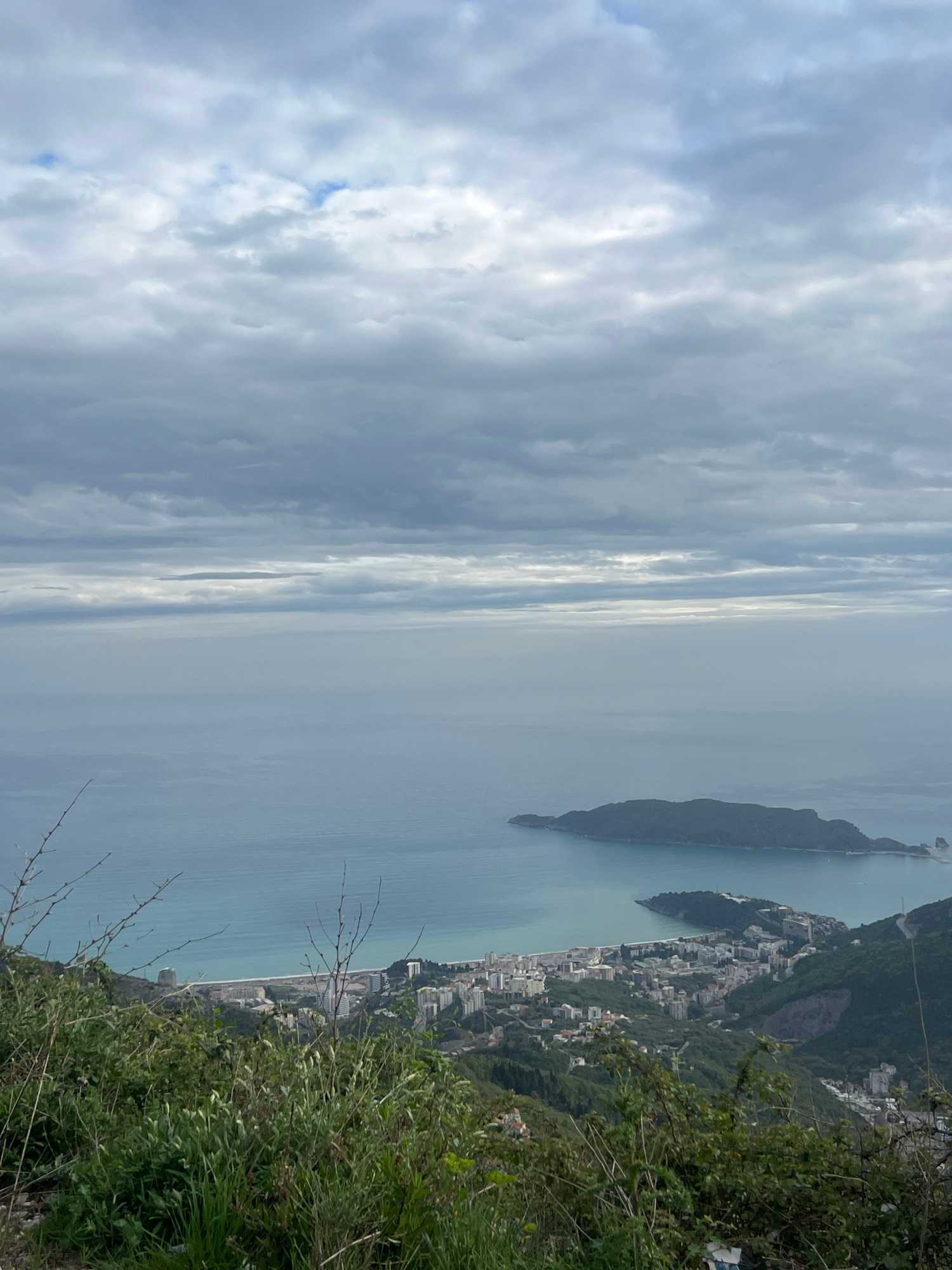 From an elevated vantage point in Brajici, Montenegro, an oblique view captures a hazy coastline. The Adriatic Sea extends from the foreground to the horizon, merging with a heavily clouded sky. An is…read more