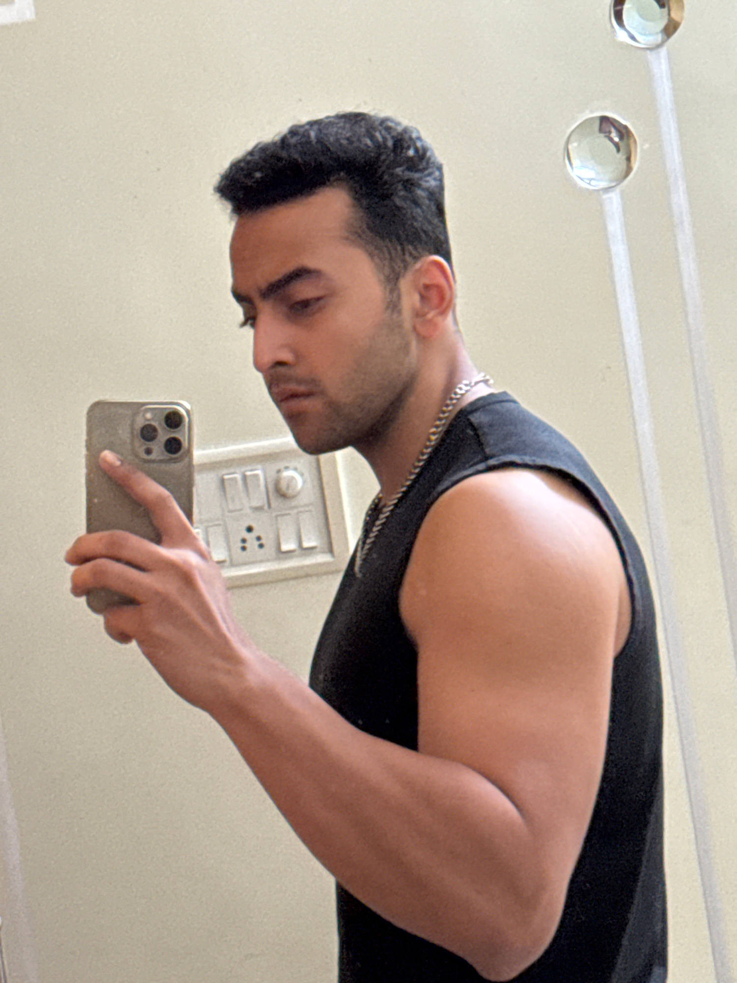 A man stands in front of a mirror, taking a selfie with a smartphone. He wears a black tank top and a silver chain necklace. A light switch panel is visible on the wall behind him. The location is not…read more