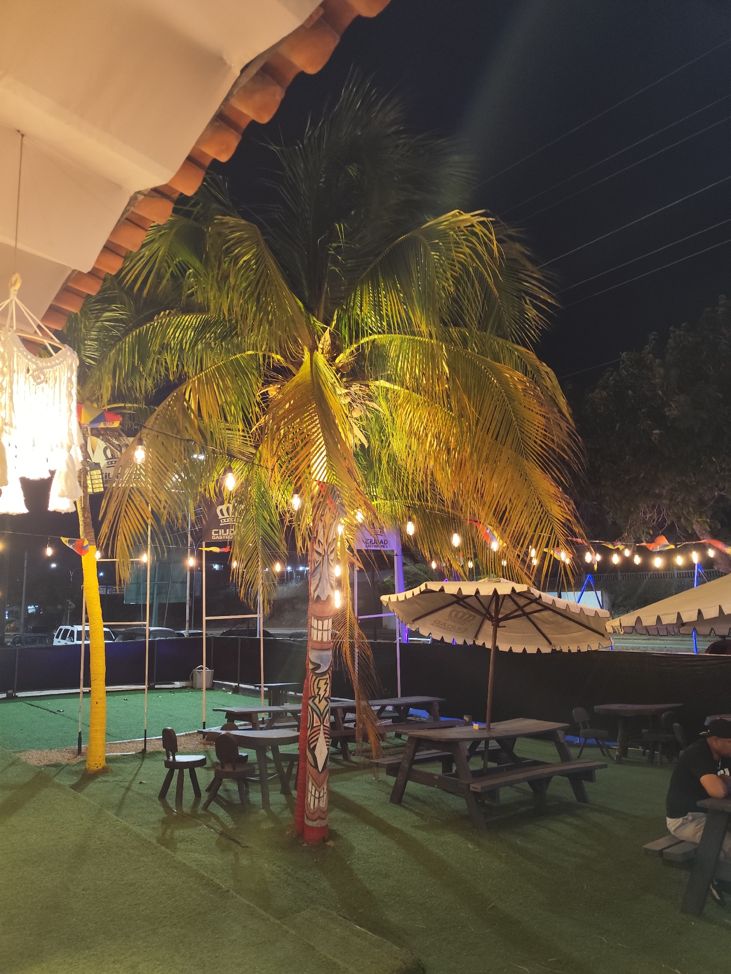 This image captures an outdoor dining or leisure area at night, located in Los Robles, Venezuela. The scene is illuminated by numerous string lights and ambient fixtures, casting a warm glow. The envβ¦read more