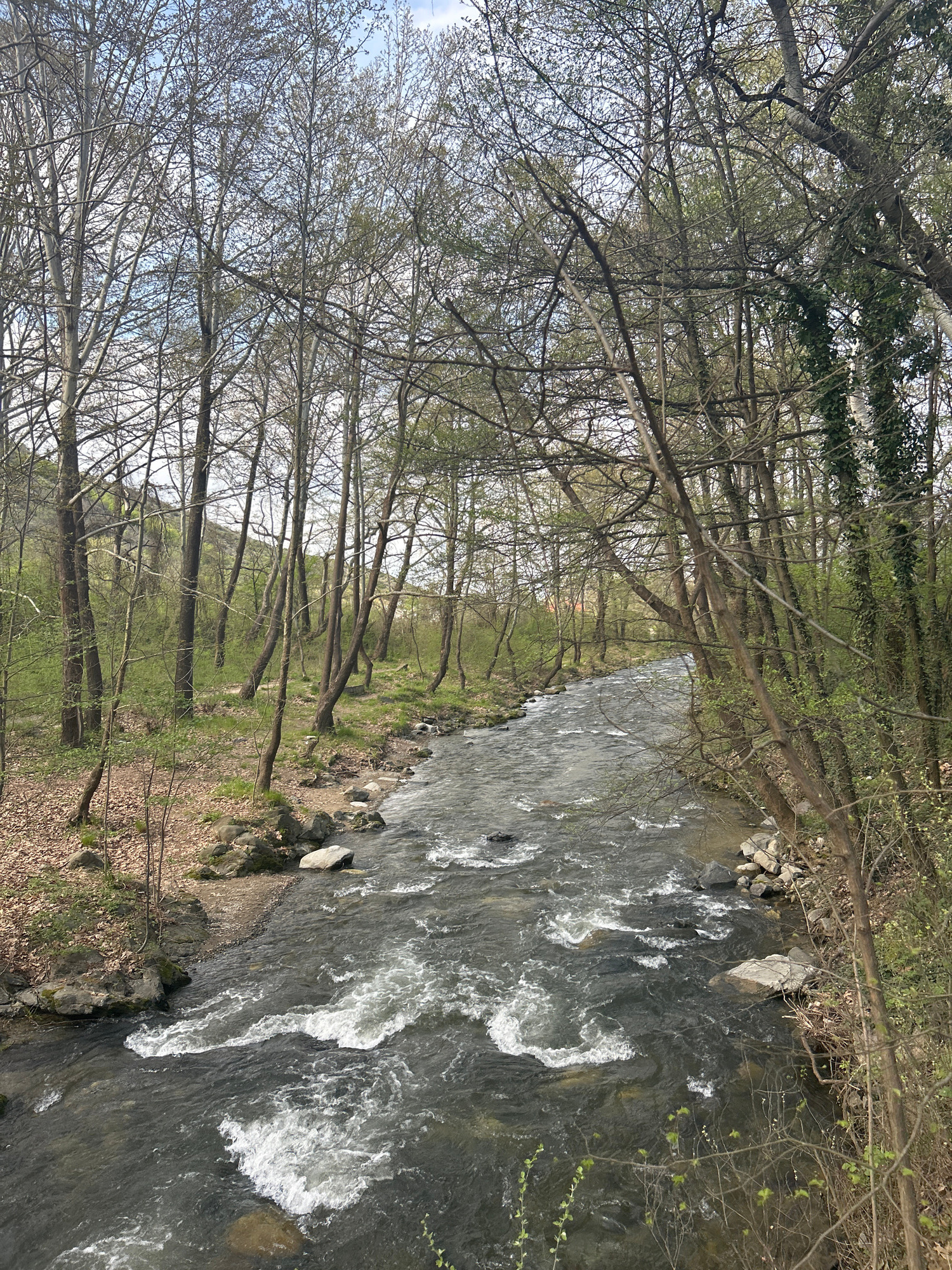 The image presents a serene natural landscape in Parvenets, Bulgaria, showcasing a dynamic river flowing alongside a wooded bank. The river, occupying the right side of the frame, features dark, rushi…read more