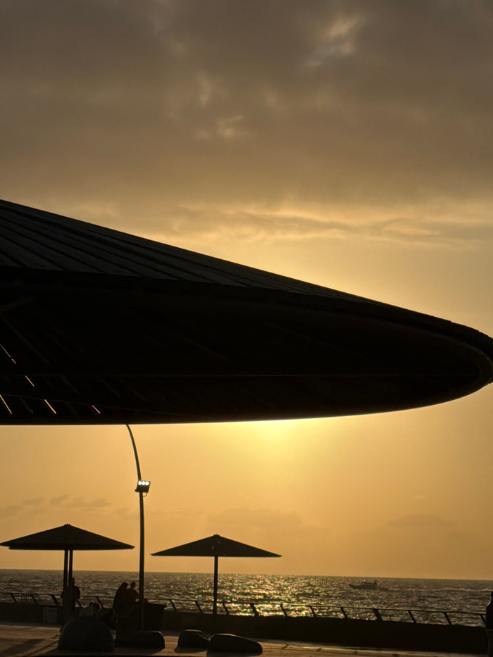 A silhouette of a tall, curved building stands against a yellow-tinted sky, likely at sunset. To the right, the ocean reflects the sunlight. Two shade structures with triangular tops are visible on a…read more