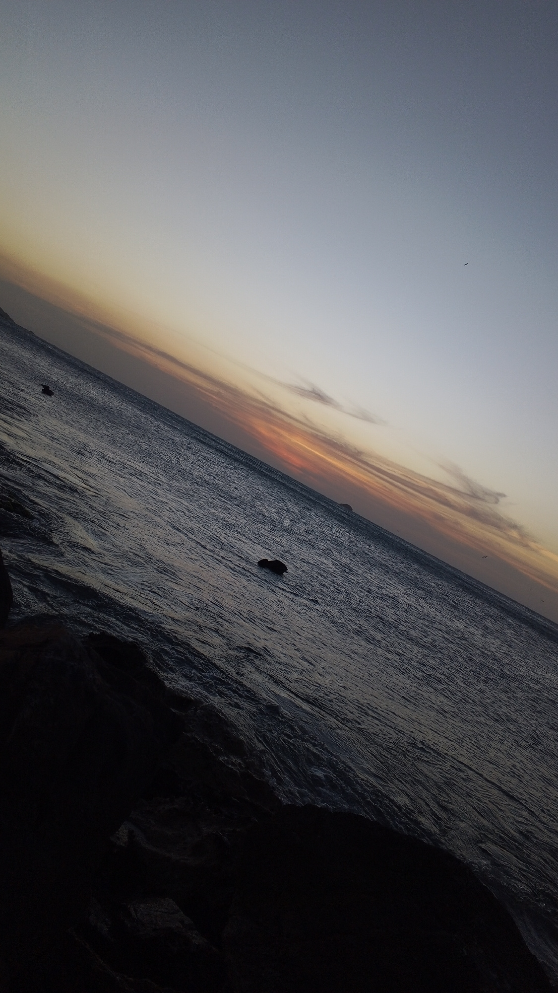 The image captures a twilight seascape in Pedro González, Venezuela. The foreground is dominated by dark, rocky formations. The ocean extends into the middle ground with dark water, and a few small ob…read more