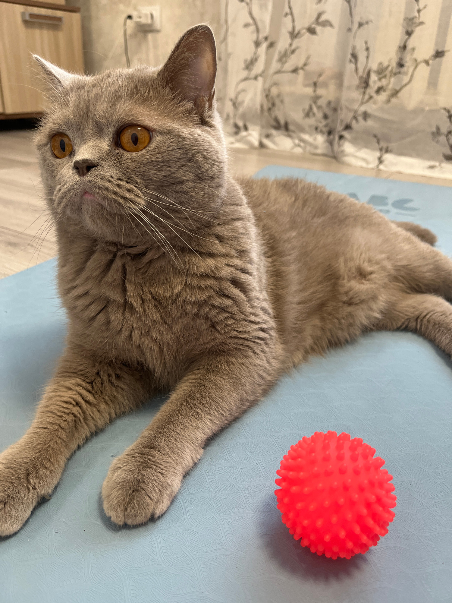 A short-haired grey cat is captured in a relaxed pose indoors, lying stretched out on a light blue mat. The cat has dense, plush grey fur, prominent white whiskers, and striking amber-orange eyes, whi…read more