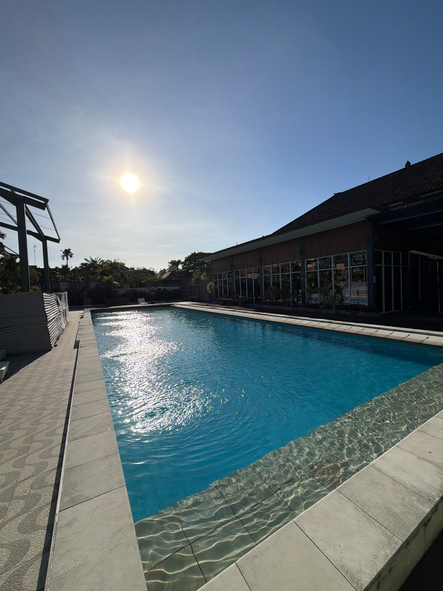 The image depicts a rooftop pool in North Kuta, Indonesia, under a bright, sunny sky. The rectangular pool, filled with blue water reflecting sunlight, is bordered by light gray tiles. Adjacent to theโฆread more