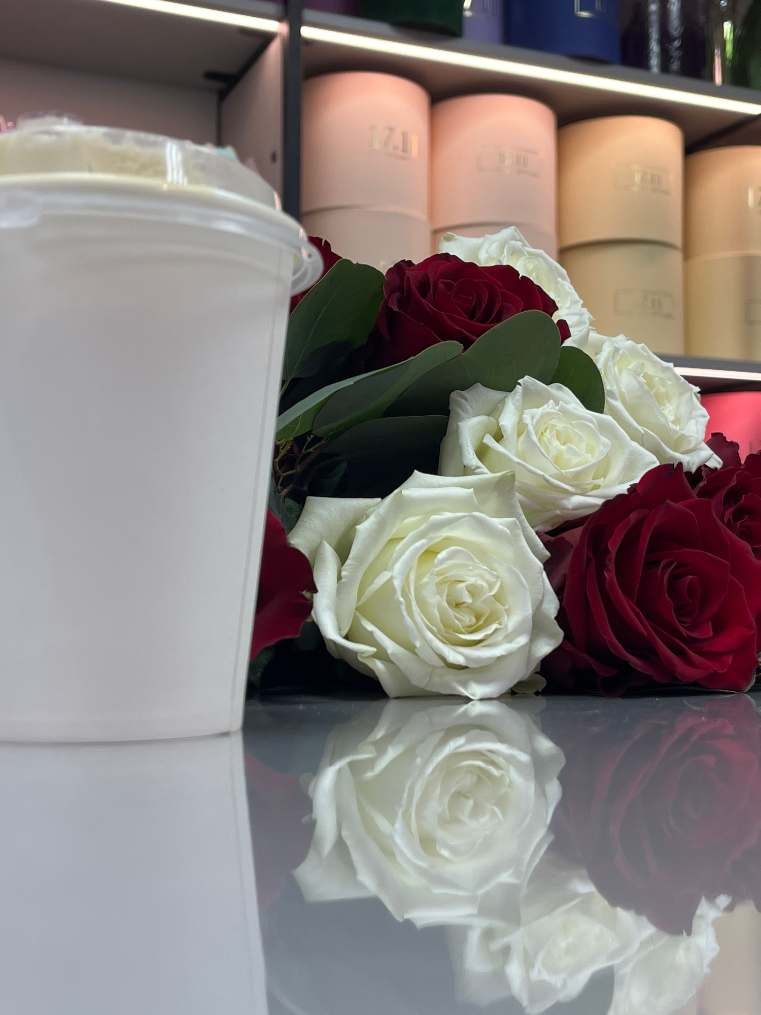 A photograph taken in what appears to be a shop in the city of Chaikovsky, Russia, features a bouquet of red and white roses in a black box. A clear plastic lid is partially obscuring the flowers. In…read more
