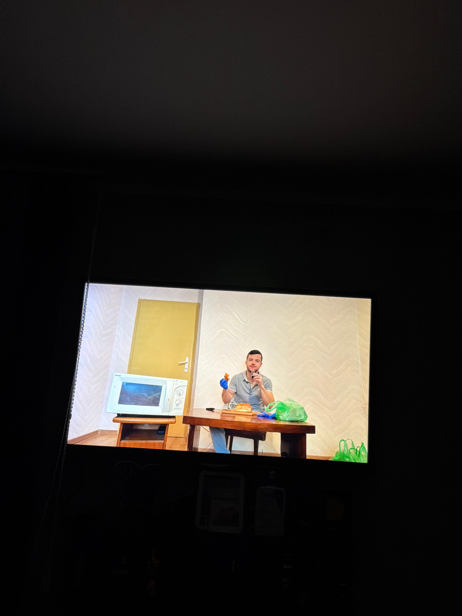 The image shows a television screen displaying a scene of a person in a kitchen. The person is wearing gloves and seems to be interacting with something on the table. There are green plastic bags on t…read more