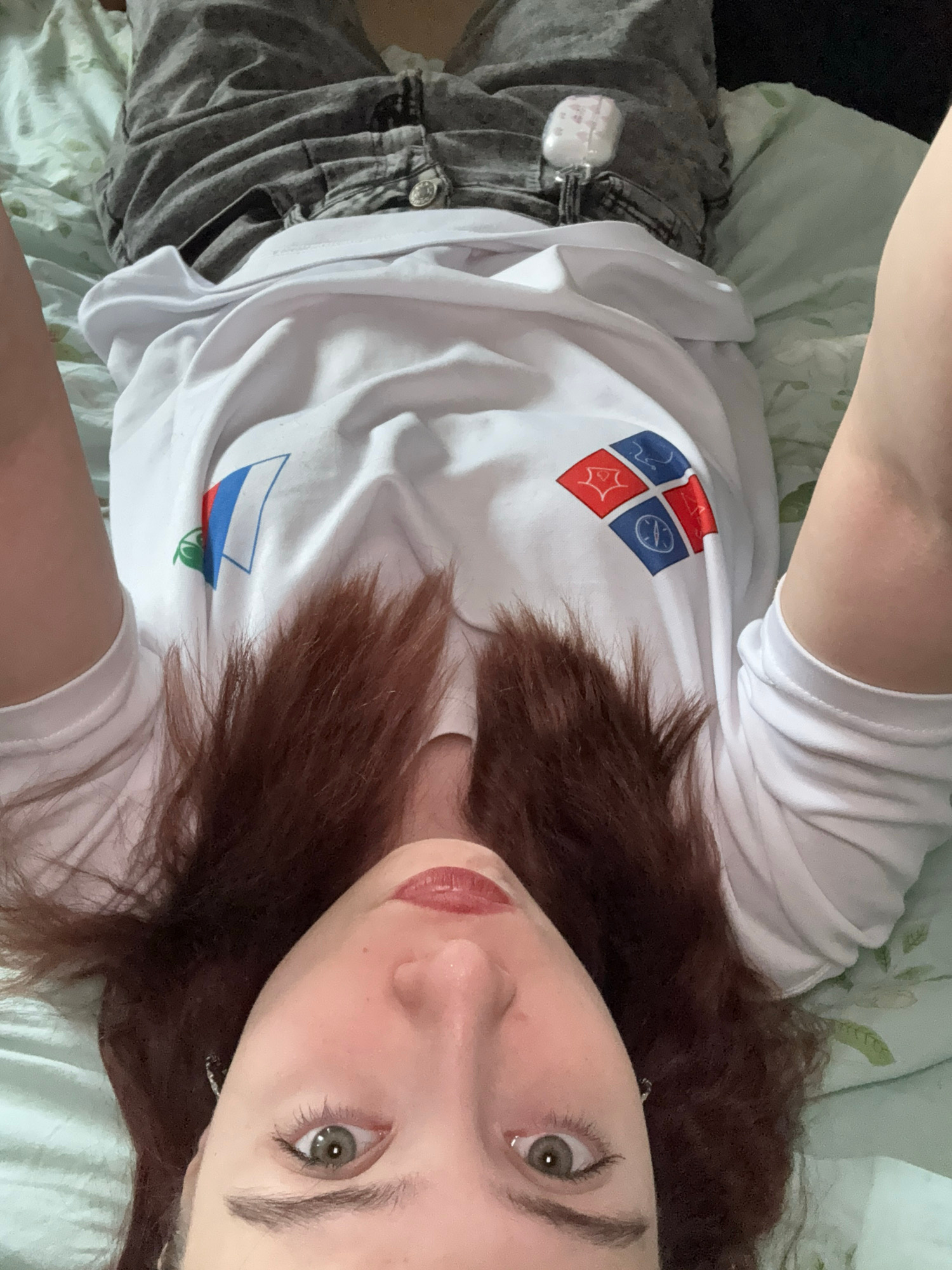 A selfie taken indoors shows a woman with shoulder-length brown hair lying on her back on a bed covered with a light green floral-patterned bedsheet. She has fair skin, grey eyes, a nose piercing, and…read more