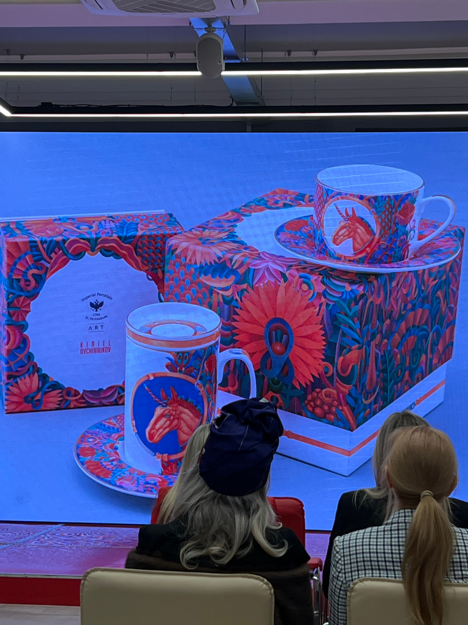 The image shows a display featuring porcelain products, likely tea cups and boxes, designed by Kirill Ovchinnikov Art from Imperial Porcelain, Saint Petersburg, Russia. The products are decorated withβ¦read more