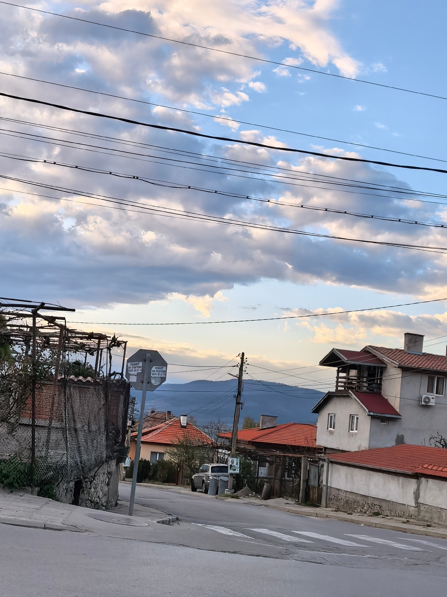 The image shows a street scene in an urban area, likely a town or village. The sky is partly cloudy with blue patches visible. Overhead are several electrical or utility wires. On the left side of th…read more