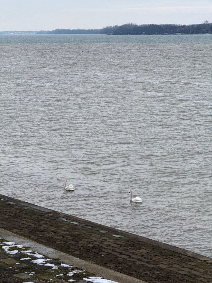 This image, oriented correctly, depicts a serene waterscape, likely a river or large lake, under an overcast sky. The majority of the frame is filled by the vast expanse of grayish-blue water, charact…read more