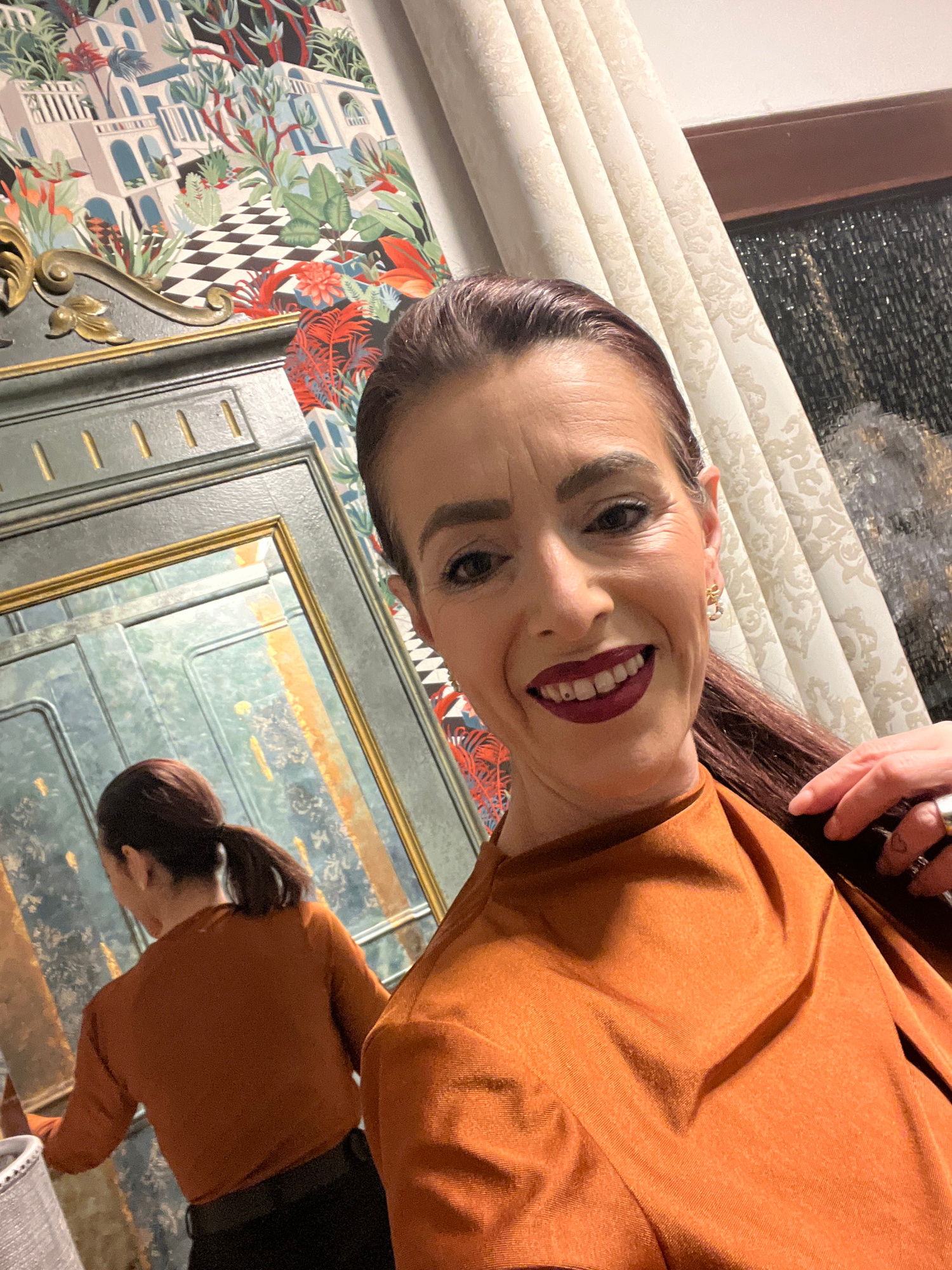 A woman with brown hair pulled back in a ponytail, wearing a rust-colored blouse, smiles towards the camera. The background features a floral patterned wallpaper and a framed mirror reflecting a porti…read more