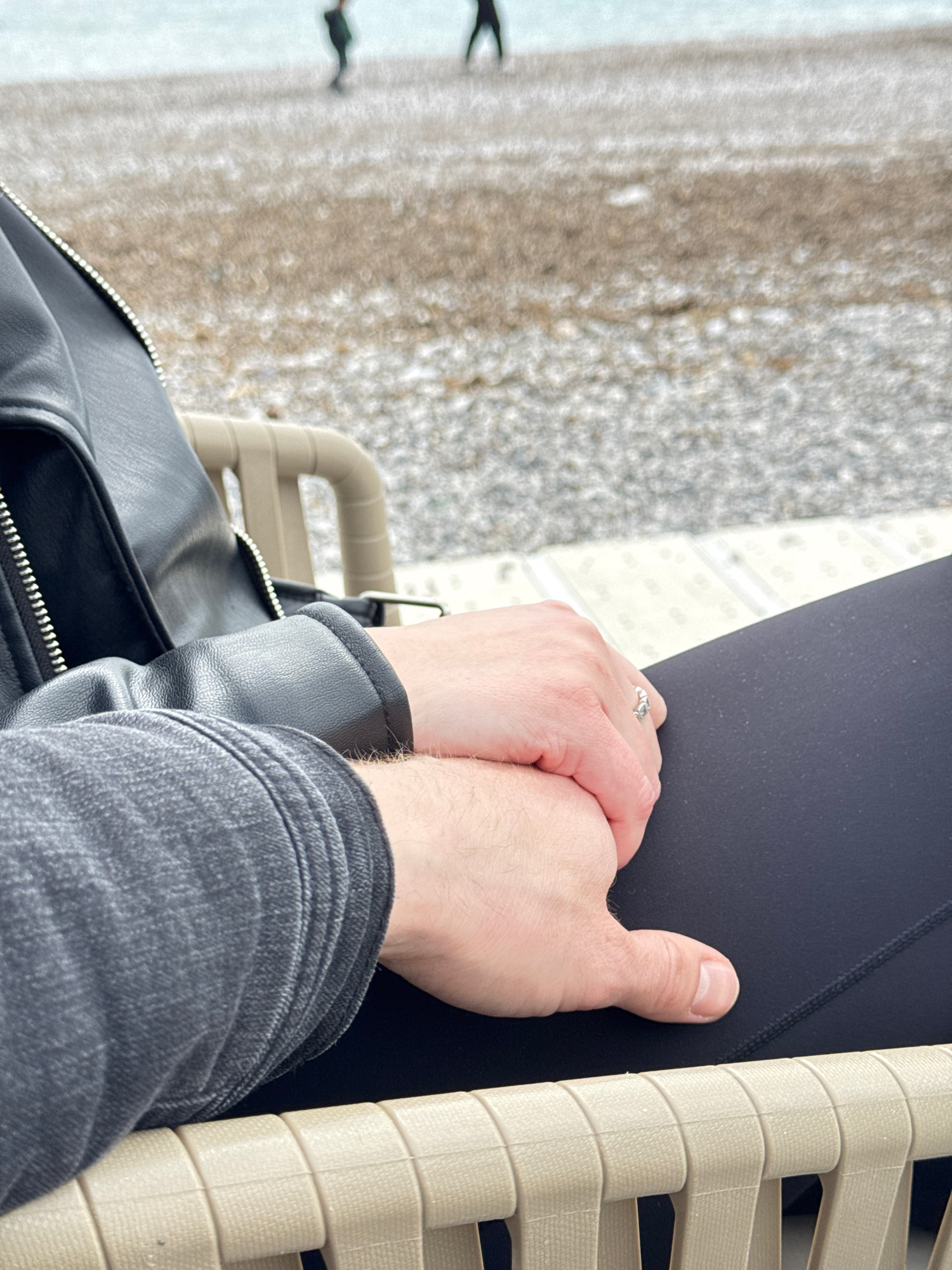A close-up, high-angle shot shows a person seated, with crossed hands resting on their lap, and a black leather jacket beside them. The left hand has a ring on its ring finger. The person appears to b…read more