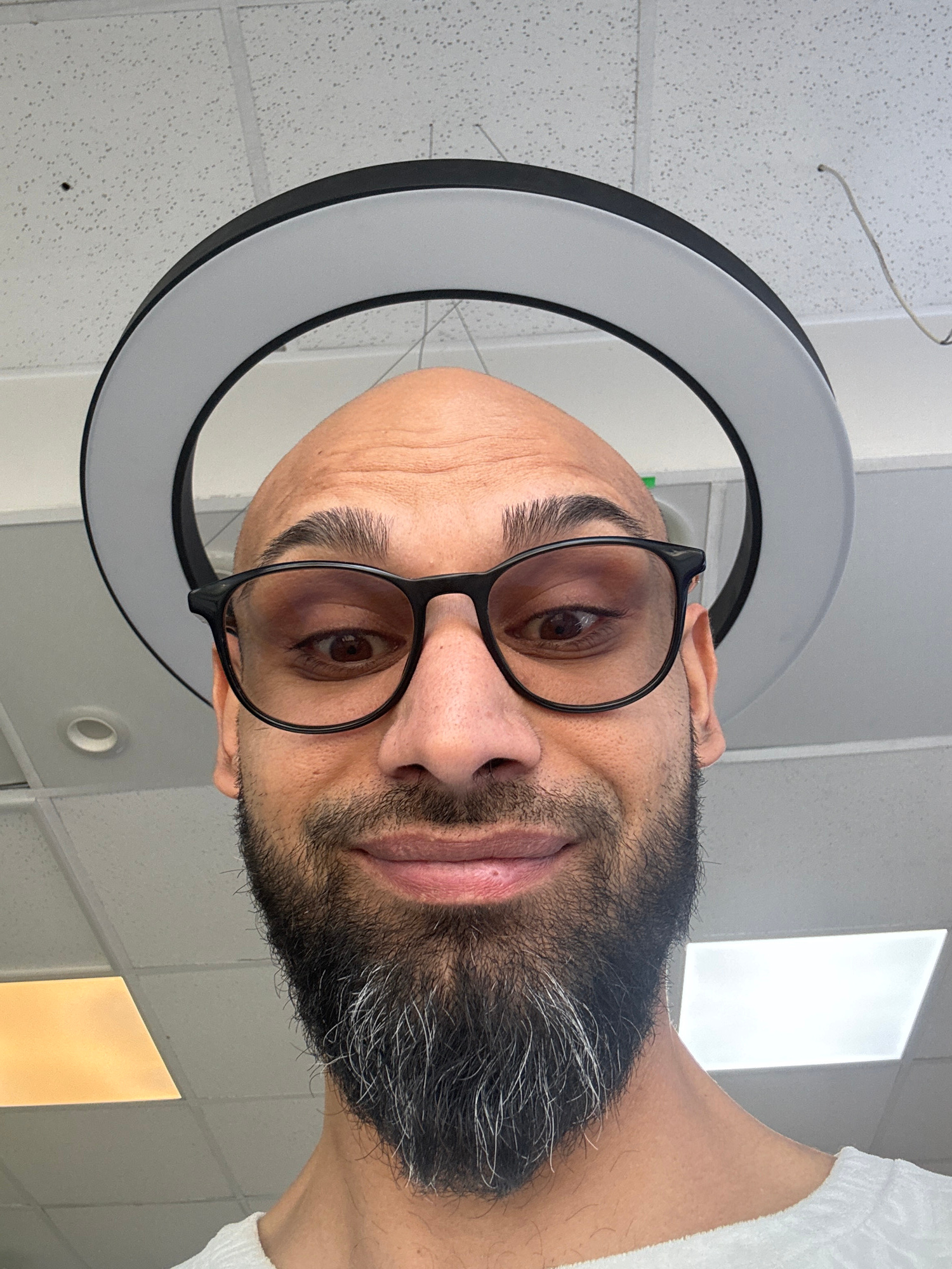 A close-up, slightly upward-angled portrait of a light-skinned man with a shaved head and a dark beard with some grey hairs, wearing black-rimmed glasses. He is looking directly at the camera. A ring…read more