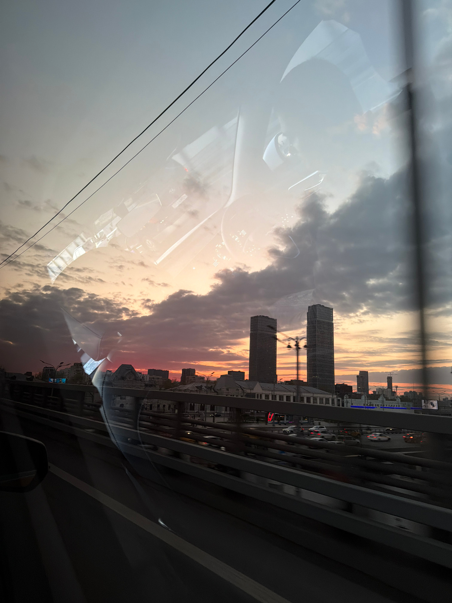 The image, taken from inside a car, shows a sunset view of a city skyline reflecting on the windshield. The reflection obscures the view, but it is possible to discern two tall buildings in the foregr…read more