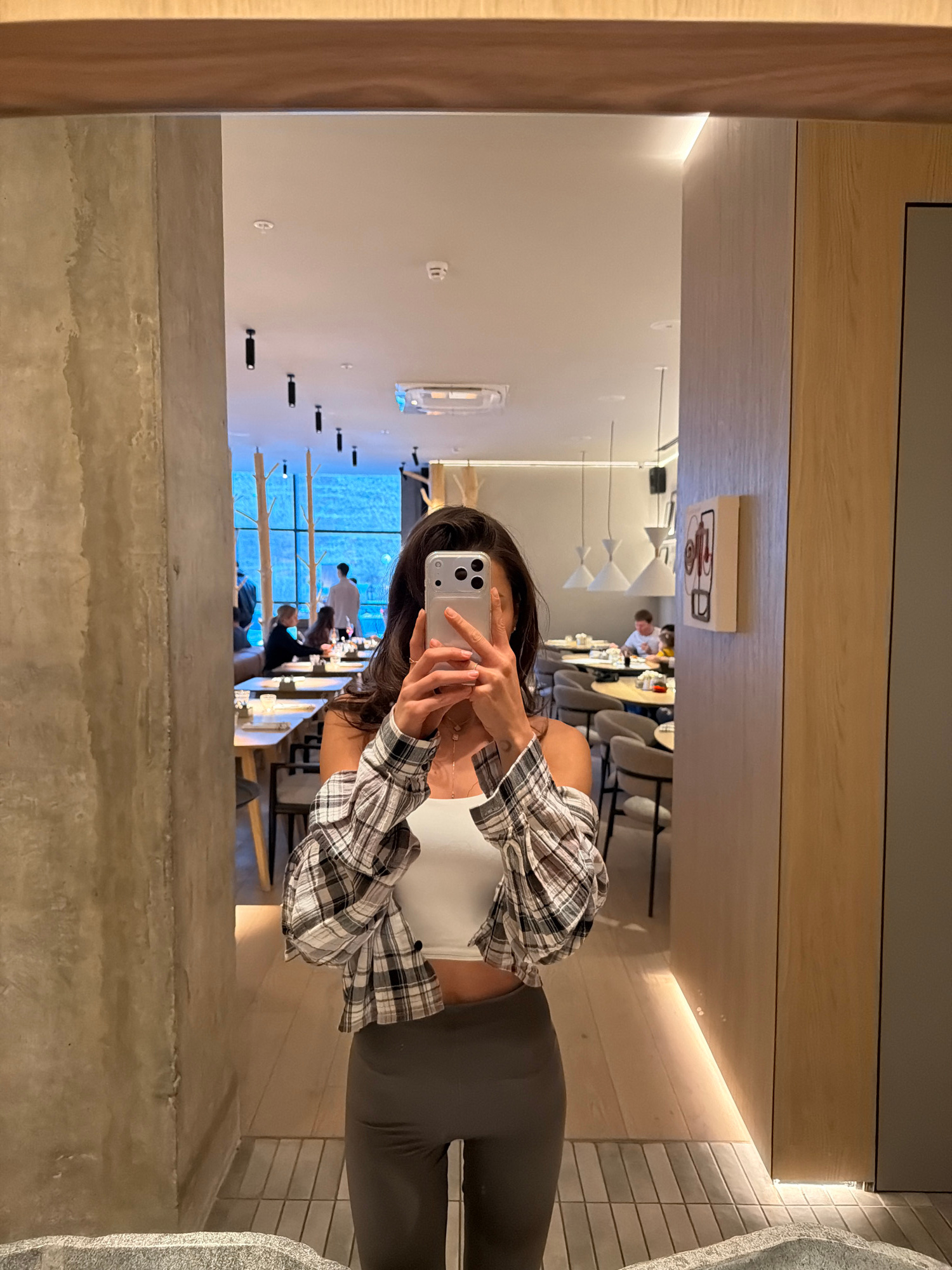 A person is captured in a mirror selfie within a modern interior, likely a restaurant or hotel lounge. The central subject, appearing to be a woman, holds a silver iPhone (possibly a Pro model) with m…read more