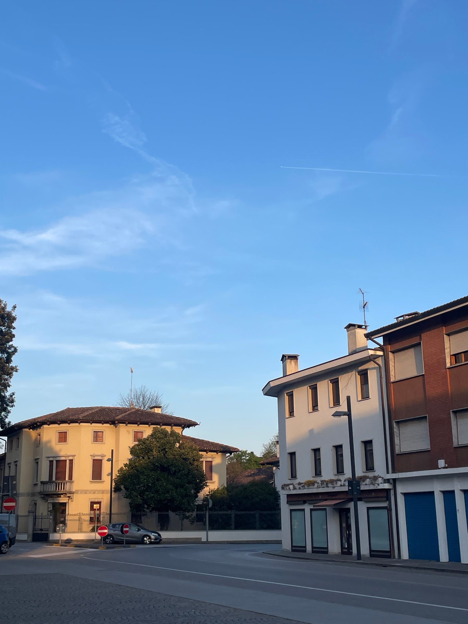 The image depicts a street scene in Case / Scjasis, Italy. The sky is blue with faint wisps of clouds and a contrail from an aircraft. Buildings line either side of the street. One building is white w…read more