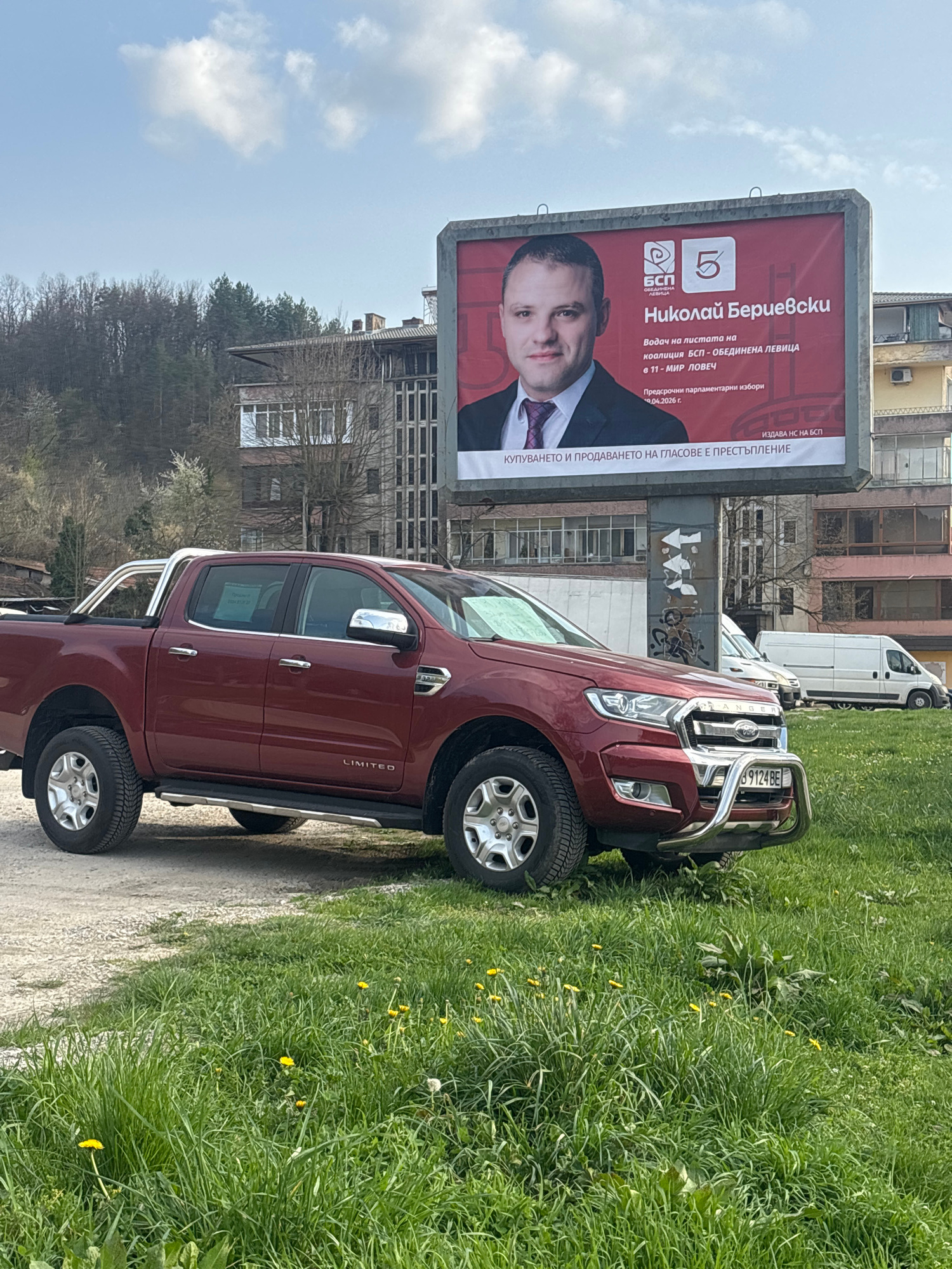 The image depicts a burgundy Ford Ranger truck parked on a dirt road next to a grassy area. Behind the truck is a large billboard featuring a portrait of Nikolai Berievski, a candidate for the coaliti…read more