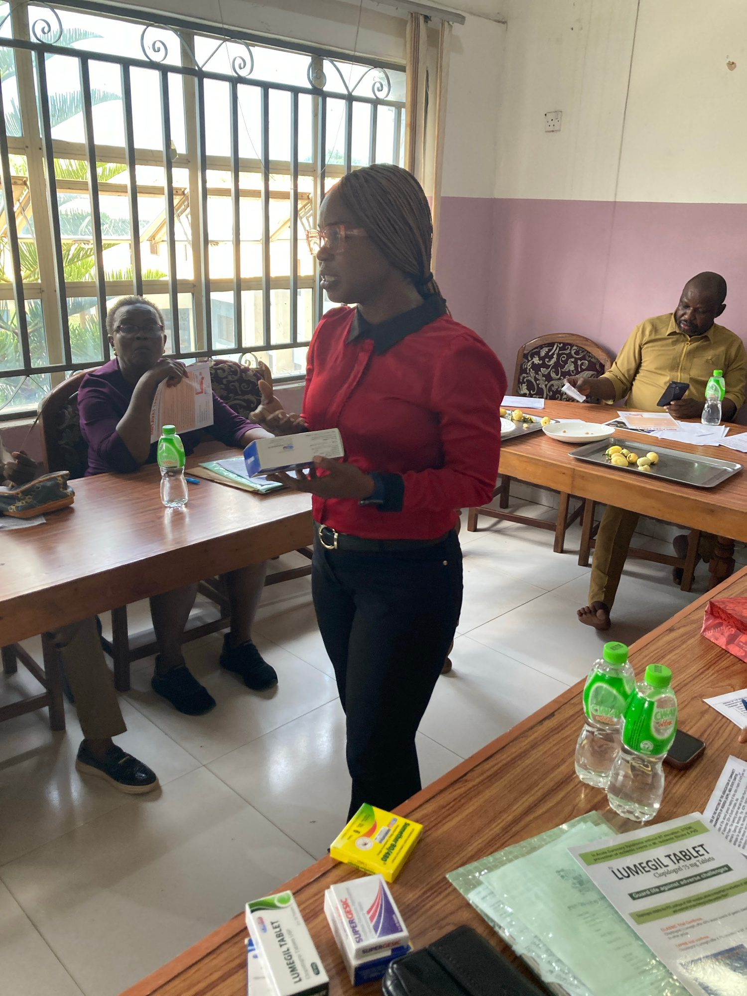 This image depicts an indoor scene, likely a meeting, presentation, or training session, involving several adults around wooden tables. The room features light-colored walls, with a section painted pi…read more