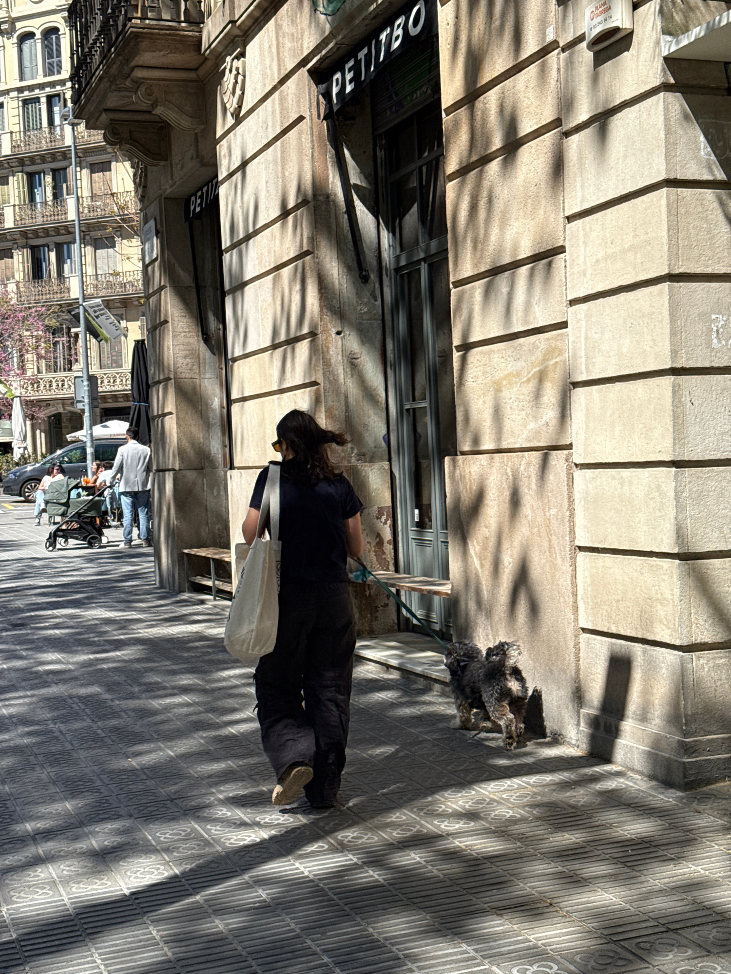 The image depicts a street scene in Barcelona, Spain, identifiable by the distinctive pavement pattern. A woman dressed in a dark outfit is bending down and holding a light-colored tote bag. Behind he…read more