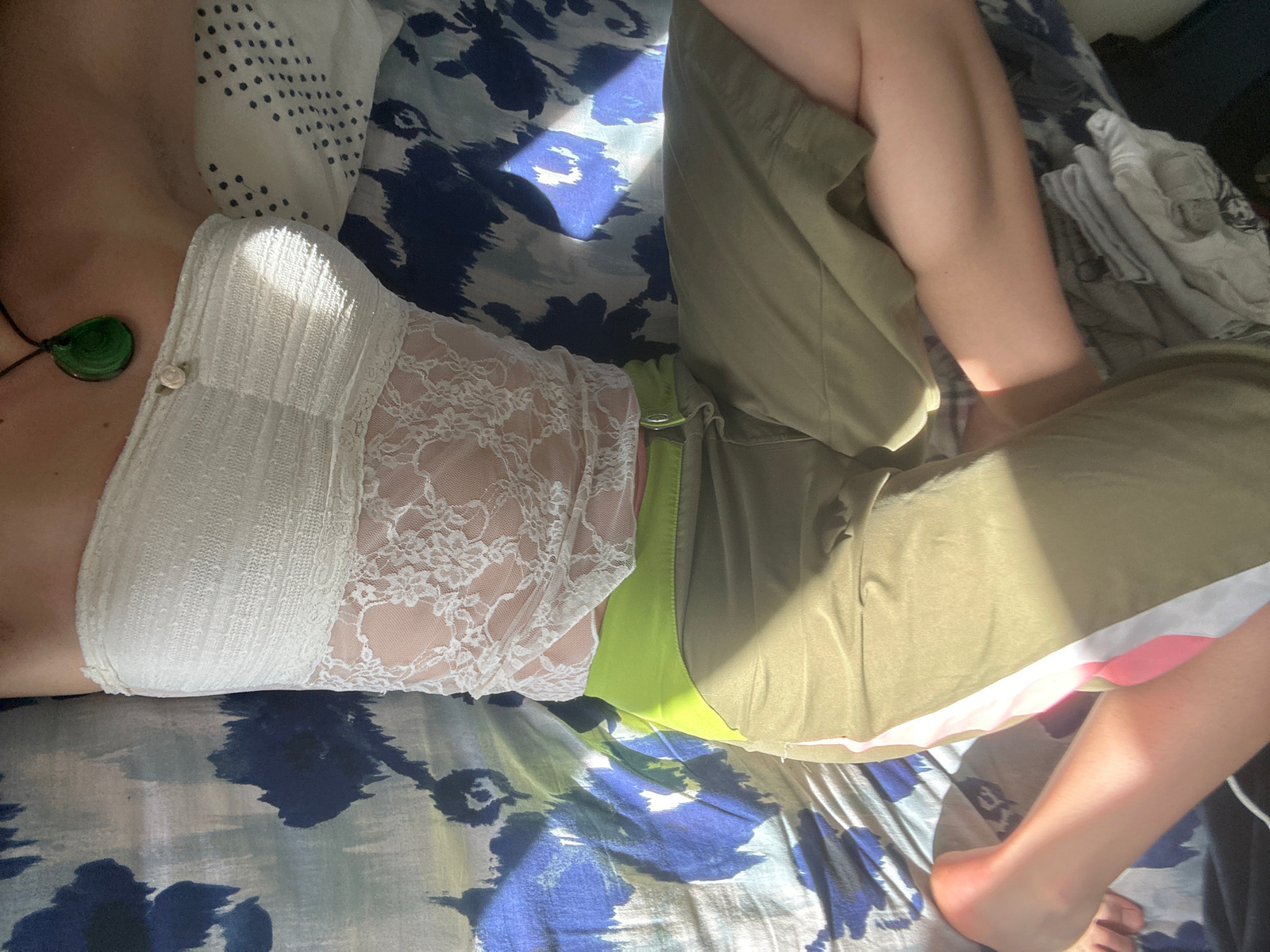 A person lies on a patterned bed sheet, wearing khaki pants with a pink and white stripe, a lime green belt, and a white lace top over a ribbed white tube top. The person is also wearing a green penda…read more
