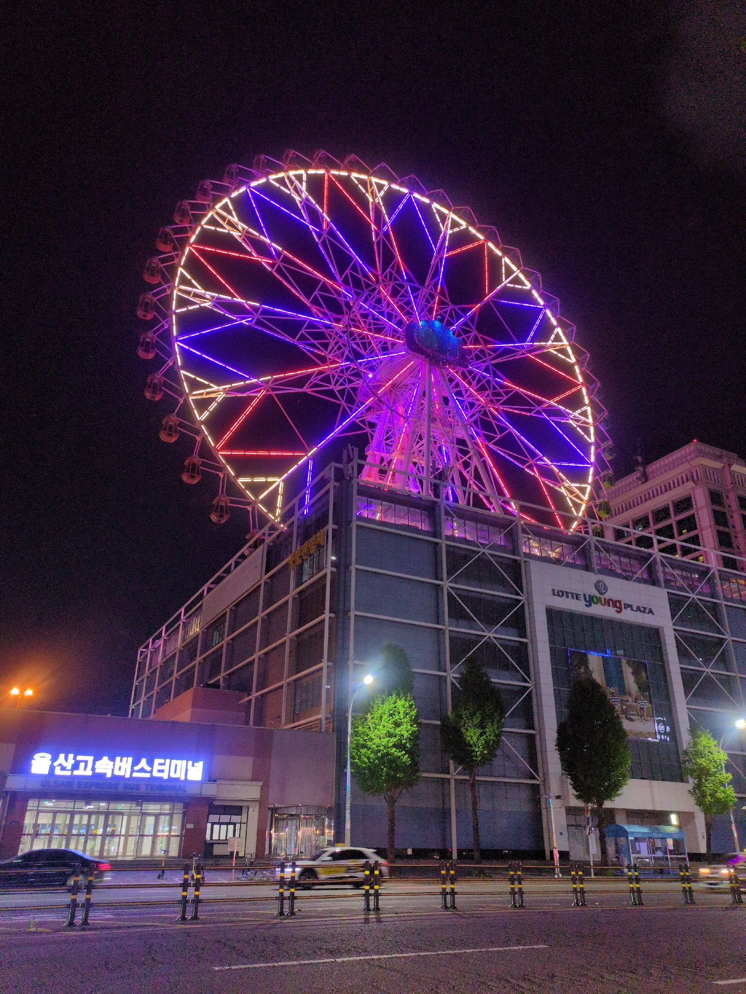 The image depicts a Ferris wheel illuminated with red, white, and blue lights at night. The Ferris wheel is positioned next to the Lotte Young Plaza building and above the Ulsan Express Bus Terminal,…read more