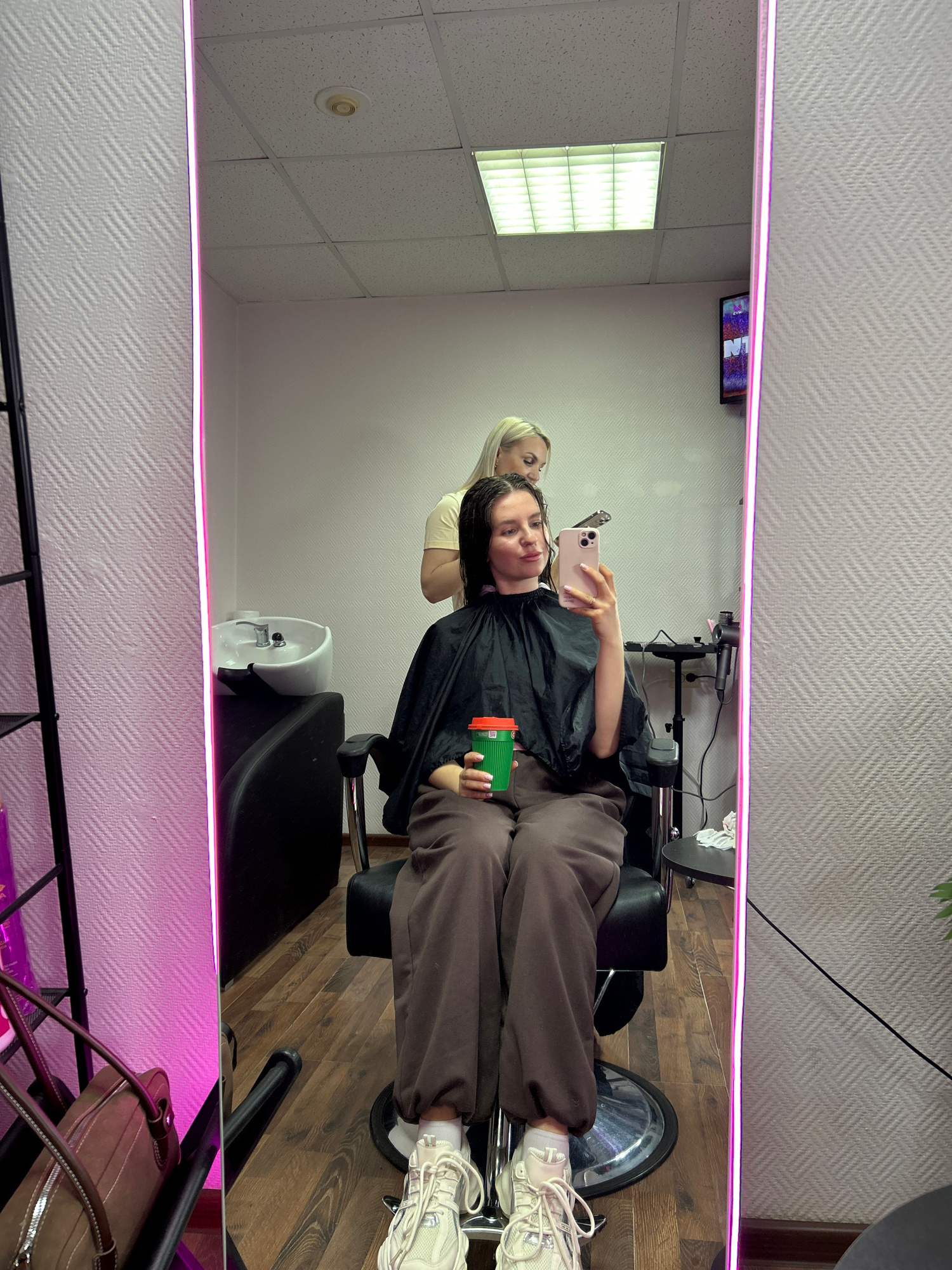 A person sits in a salon chair, holding a phone in their right hand to take a selfie. They also hold a green cup in their left hand. A stylist stands behind them, attending to their hair. The room app…read more