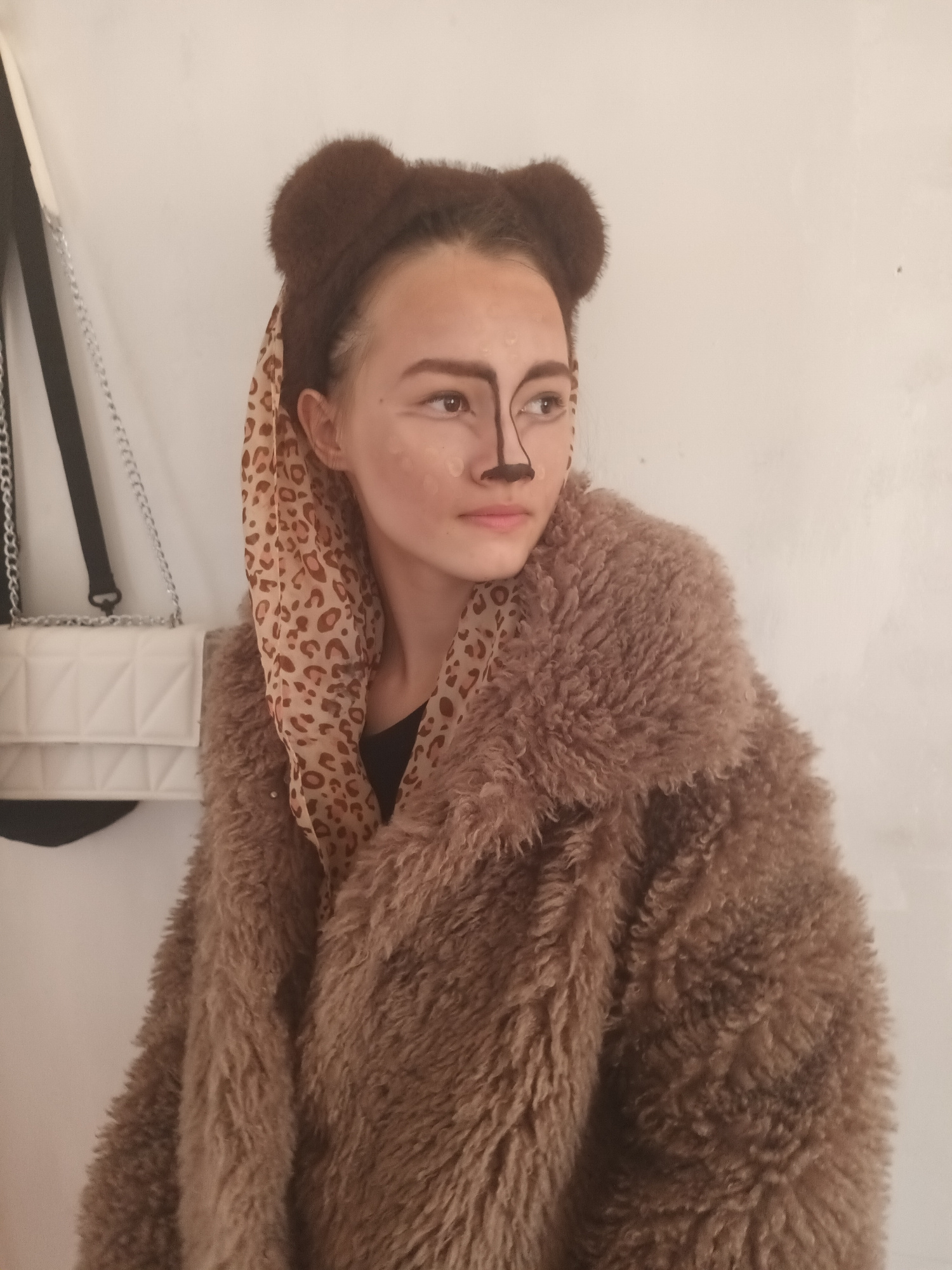 A person dressed as a bear is photographed against a white background. They are wearing a brown, furry coat and have brown bear ears attached to their head. Their face is partially covered in makeup t…read more