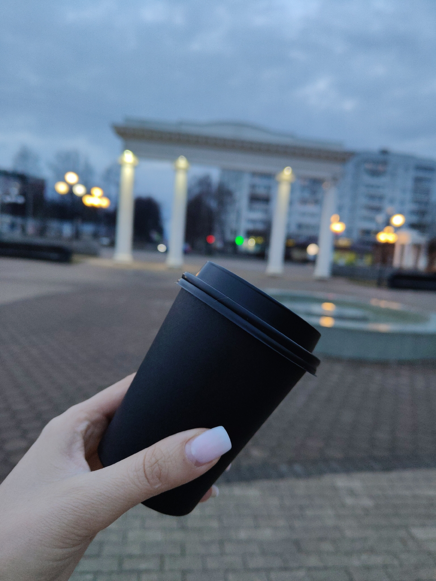 A photo shows a hand holding a black coffee cup in front of a city square. The hand, with pale skin and long white and pink fingernails, firmly grasps the cup. The cup, also black, has a lid and appea…read more