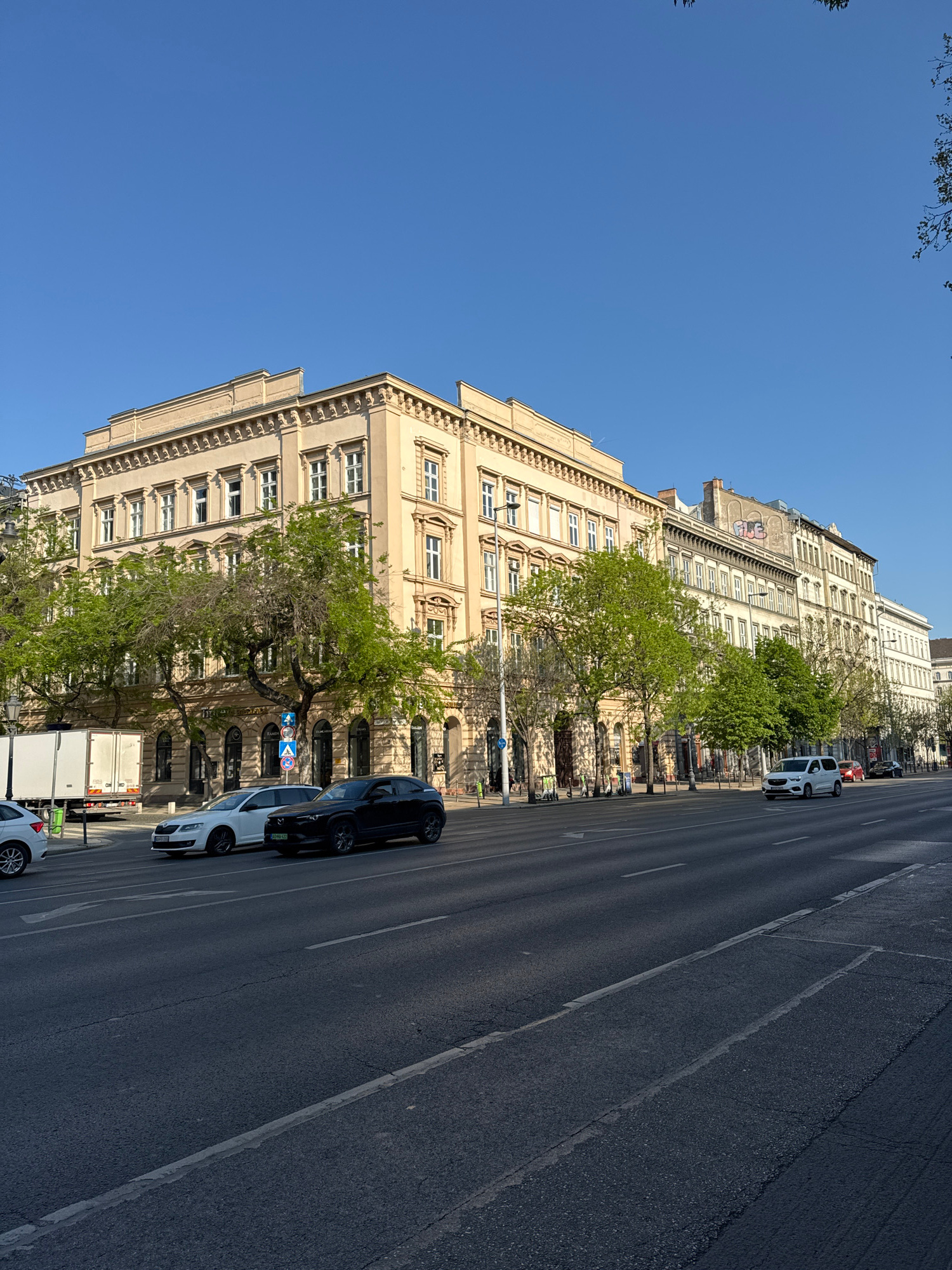 The image depicts a street scene in Budapest, Hungary, characterized by a long, straight road and buildings with light-colored facades. The buildings are multi-storied with windows regularly spaced, d…read more